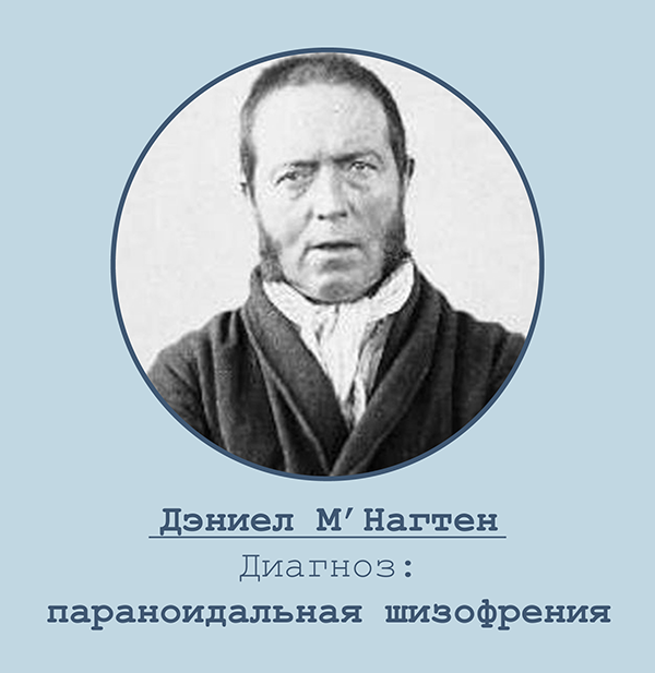Дэниел М’Нагтен родился в 1813 году в Великобритании. Он был одержим манией преследования: ему казалось, что правящая партия консерваторов объявила ему войну, регулярно подсылает к нему шпионов и практически довела его до разорения. По его логике он должен был защититься, поэтому в 1843 году совершил покушение на британского премьер-министра. Ему казалось, что он стреляет в главу правительства, хотя на самом деле преступник убил его секретаря Эдварда Драммонда. Присяжные решили, что заключенный был не в себе во время совершения преступления и оправдали его. Этот вердикт возмутил королеву Викторию. В письме к премьер-министру Уильяму Юарту Гладстону в 1882 году она написала: «Наказание останавливает не только вменяемых людей, но и эксцентричных, которые совершили противоправные деяния из-за больного мозга. Понимание того, что их оправдают из-за их невменяемости, вдохновит таких людей совершать безрассудные поступки».