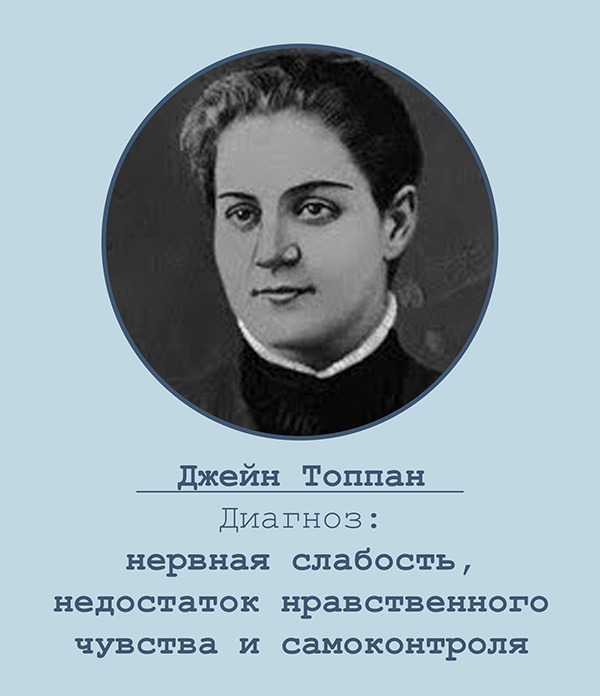 Джейн Топпан родилась в 1854 году в США. Ее мать умерла от чахотки, а отец был душевнобольным. В девять лет она вместе с сестрой попала в приют. Повзрослев, девушка начала учиться на медсестру. И тогда начали проявляться ее садистские наклонности: она ставила опыты на пациентах, изменяла назначенные дозы препаратов и смотрела, как это влияет на них. По несколько раз она могла вводить огромную дозу наркотика и реанимировать жертву. Многие не выдерживали таких экспериментов. Когда больной умирал, Топпан ложилась с ним рядом и обнимала умирающего, таким образом получая наслаждение. Однажды родственники погибшего настояли на экспертизе и узнали об отравлении. Медика задержали, тогда она призналась в убийстве 31 пациента. После психиатрических экспертиз Джейн Топпан признали невменяемой. Врачи диагностировали у нее нервную слабость и недостаток нравственного чувства и самоконтроля. Топпан определили на пожизненное пребывание в психиатрическую больницу, где в 1938 году она умерла.