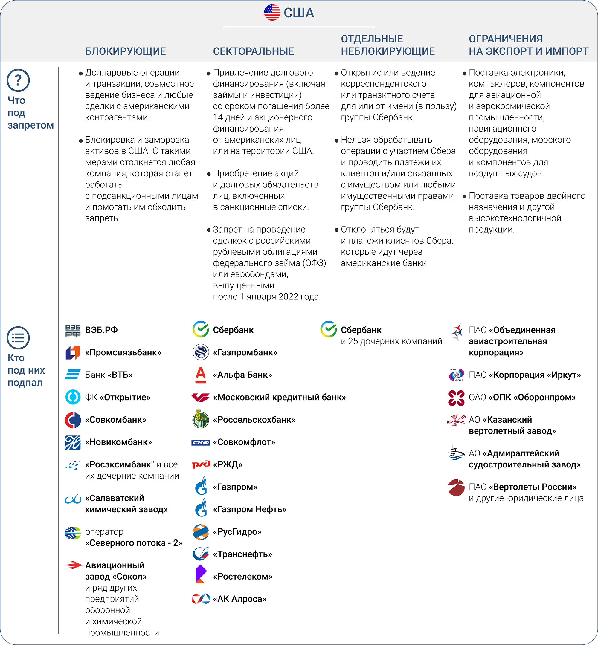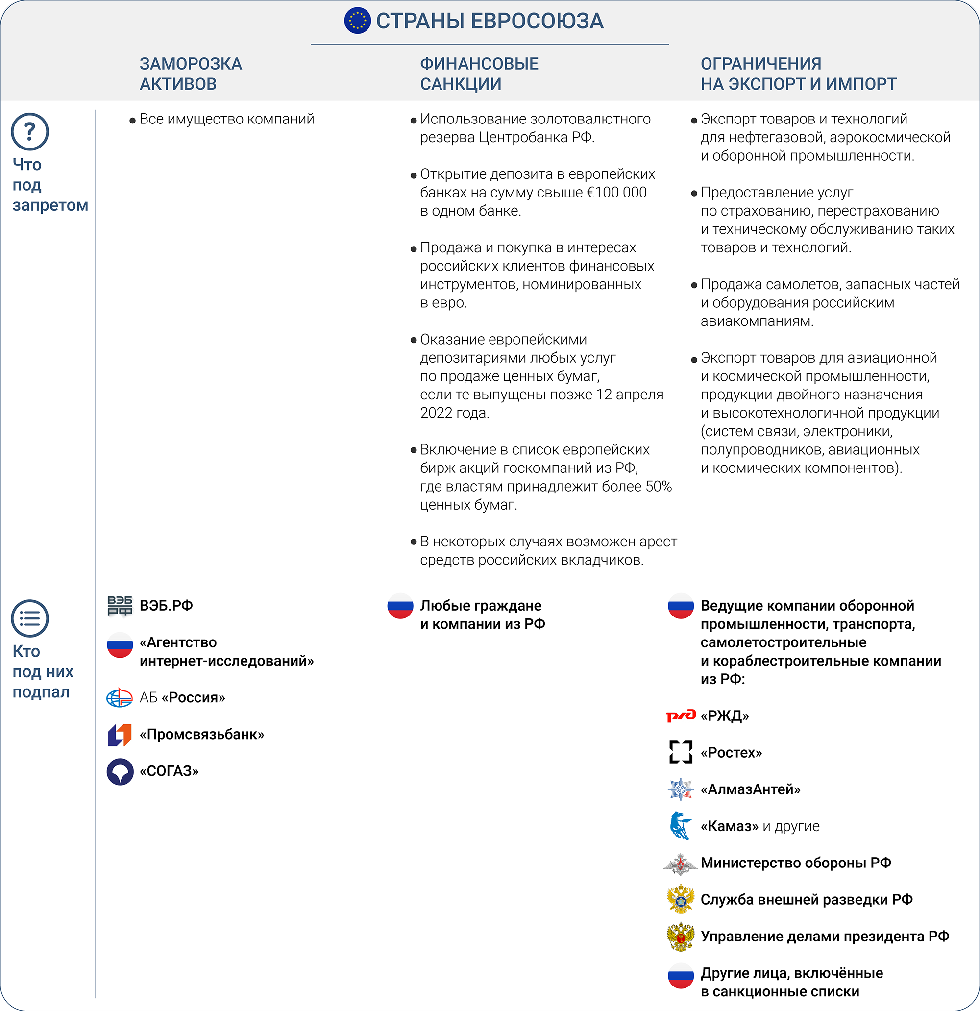 * Использована информация из санкционных обзоров адвокатского бюро «Егоров, Пугинский, Афанасьев и партнеры», юридической фирмы Nektorov, Saveliev & Partners, а также Российского экспортного центра.
