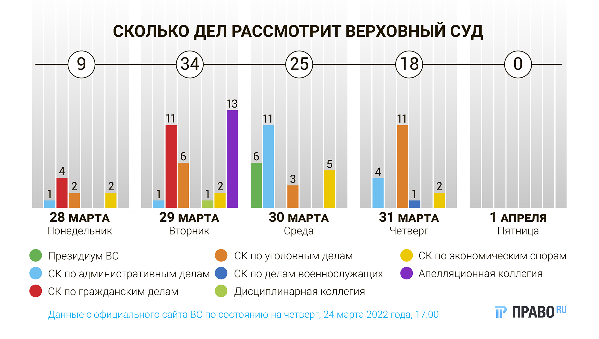 На последней неделе марта — менее 100 споров. Судейские полномочия постарается вернуть экс-судья из Бурятии, которого со второго раза лишили мантии за волокиту. Экономколлегия разберется, за какие бездействия управляющий должен возмещать убытки и в какой форме можно выражать согласие на использование товарного знака. Гражданская коллегия выяснит, кто виноват в ошибочном банковском платеже и переиздавало ли издательство книги петербургского адвоката.