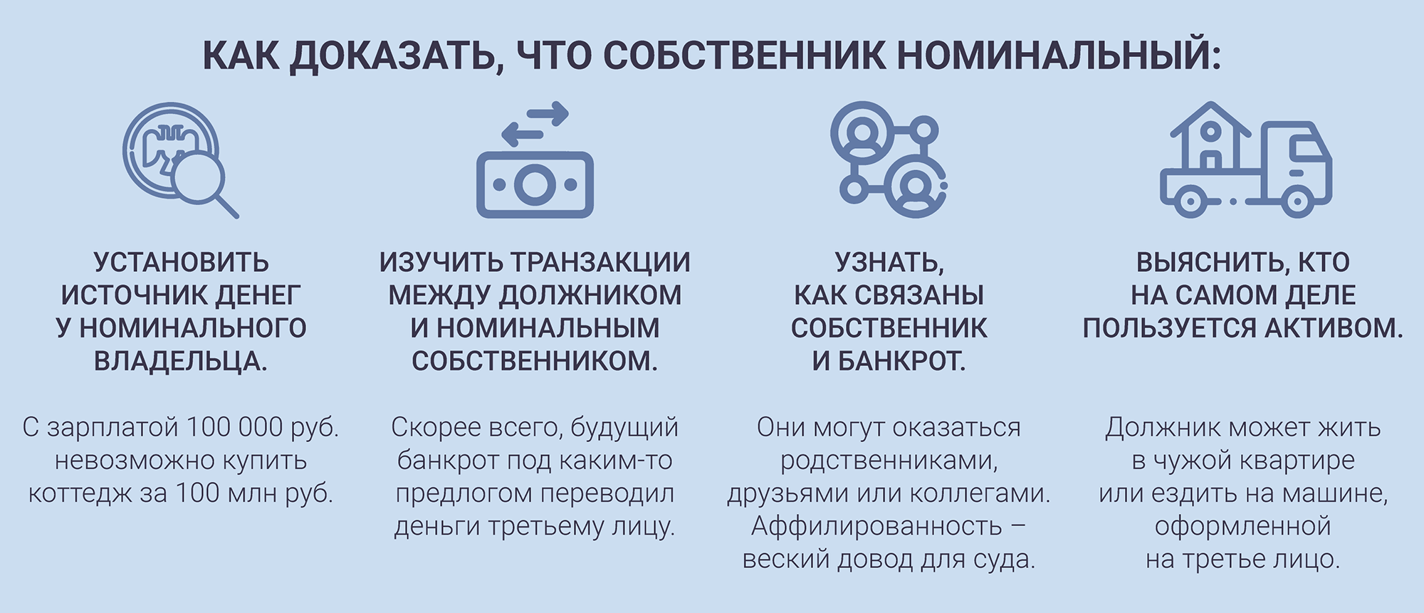 Самый простой способ «вывести» имущество в банкротстве — продать или подарить. Но такие очевидные сделки легко оспаривают в процедуре, а ценности возвращают в конкурсную массу. Поэтому будущие банкроты перестали оформлять недвижимость и машины на себя, а сразу регистрируют актив на знакомых или родных. Из-за этого судебная практика стала расширять возможности конкурсного управляющего по выявлению и возврату такого имущества. На протяжении последних 5–7 лет формируется тенденция обращать взыскание на то, что никогда официально не принадлежало должнику, говорит Леонид Ковалев из КА «Адвокат Премиум». С этим согласна и Ольга Жданова, руководитель банкротной практики ЮФ INTELLECT По ее словам, скрывать активы становится все сложнее. А суды в банкротных делах стараются подходить к рассмотрению споров неформально, внимательнее отслеживают судьбу спорного имущества.