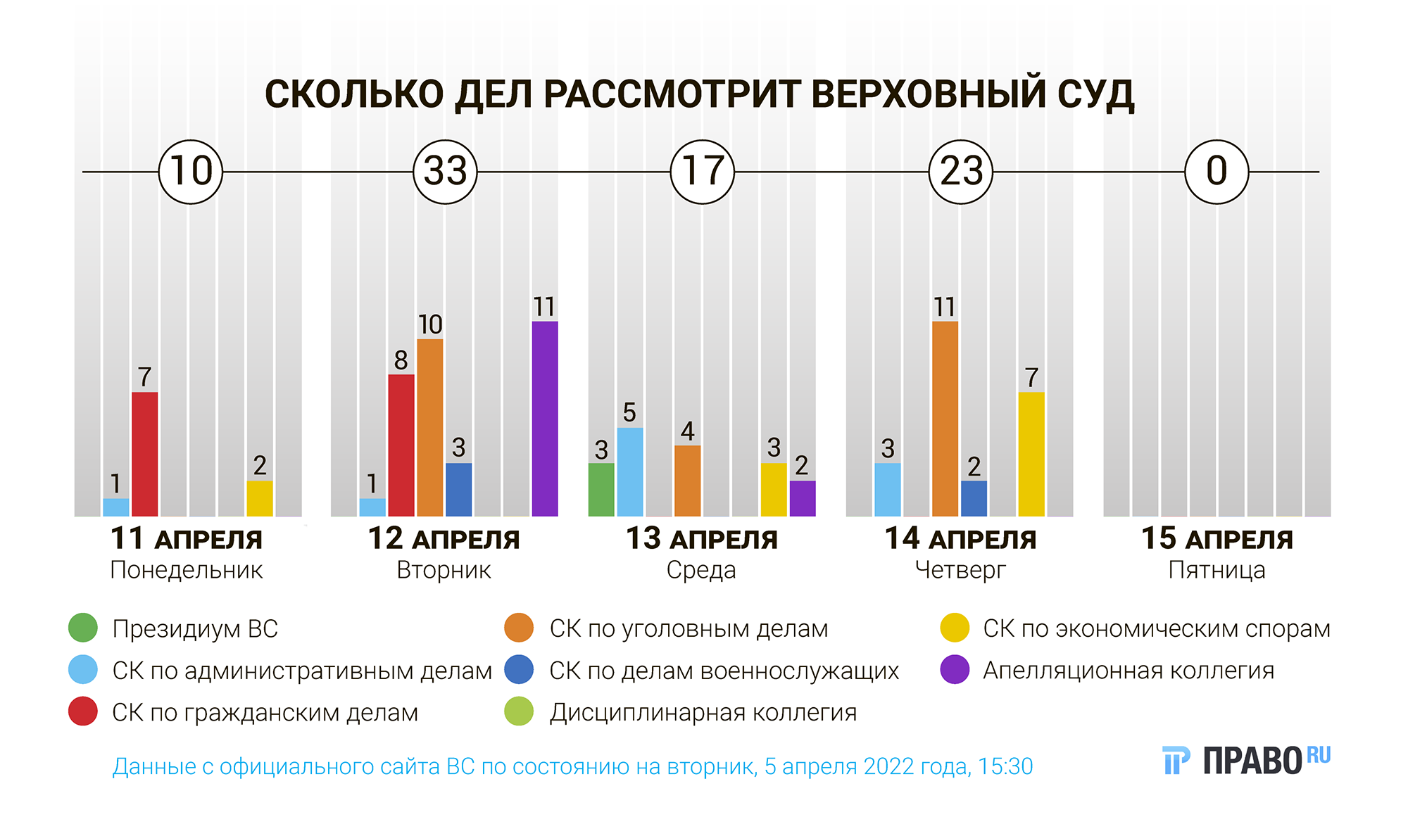На неделе с 11 по 15 апреля Верховный суд рассмотрит 83 дела. В административной коллегии разберутся с уголовным преследованием бывшей судьи Елены Хахалевой, а также с историей о велосипедисте, сбитом насмерть, другим краснодарским судьей. Гражданская коллегия изучит последствия ошибочного банковского перевода и оценит убытки от незаконного уголовного преследования. Экономколлегия разъяснит, влияет ли выбранный способ защиты на возможность взыскания убытков. Также судьи разберутся в банкротных спорах об уступке ликвидного права требования юристам и единственном жилье должника.