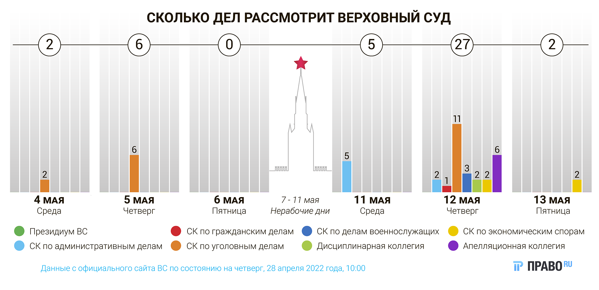 Следующие две рабочие недели будут короткими. За это время Верховный суд рассмотрит 42 дела. Активнее всего будет работать уголовная коллегия. Она рассмотрит дело сотрудника городской администрации, который незаконно зарегистрировал земельный участок, чтобы продать его своему другу. А судьи по делам военнослужащих рассмотрят жалобу военного, который заплатил за пятерку на экзамене по физкультуре. Теперь его обвиняют не только в даче взятки, но и в мошенничестве.
