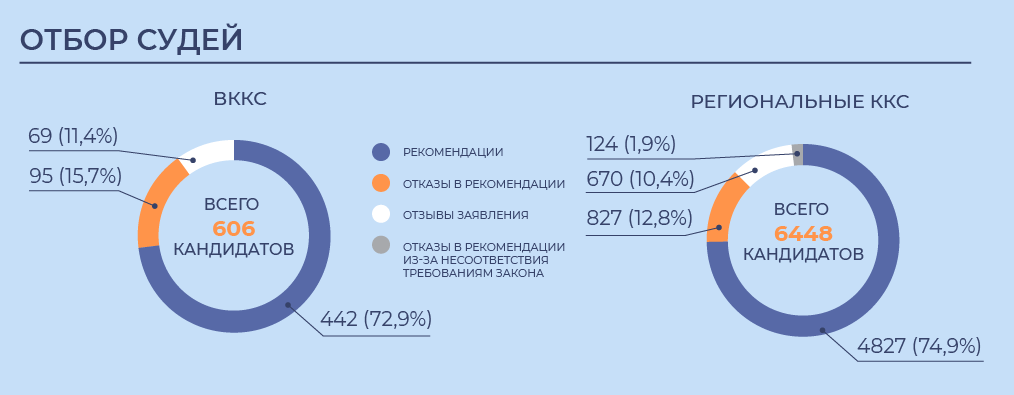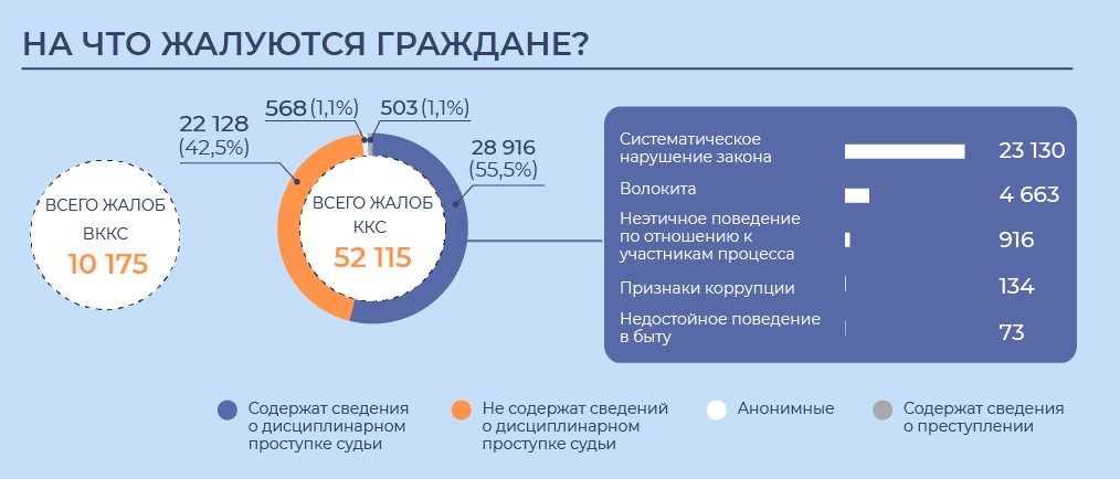 Региональные ККС за этот же период прекратили полномочия 1571 судьи и руководителя суда. В подавляющем большинстве случаев (1546) это произошло на основании заявления об отставке или по другим уважительным причинам. 24 судьи лишились своих полномочий за дисциплинарные проступки, а еще один — за несоблюдение запрета на хранение денег в иностранных банках.