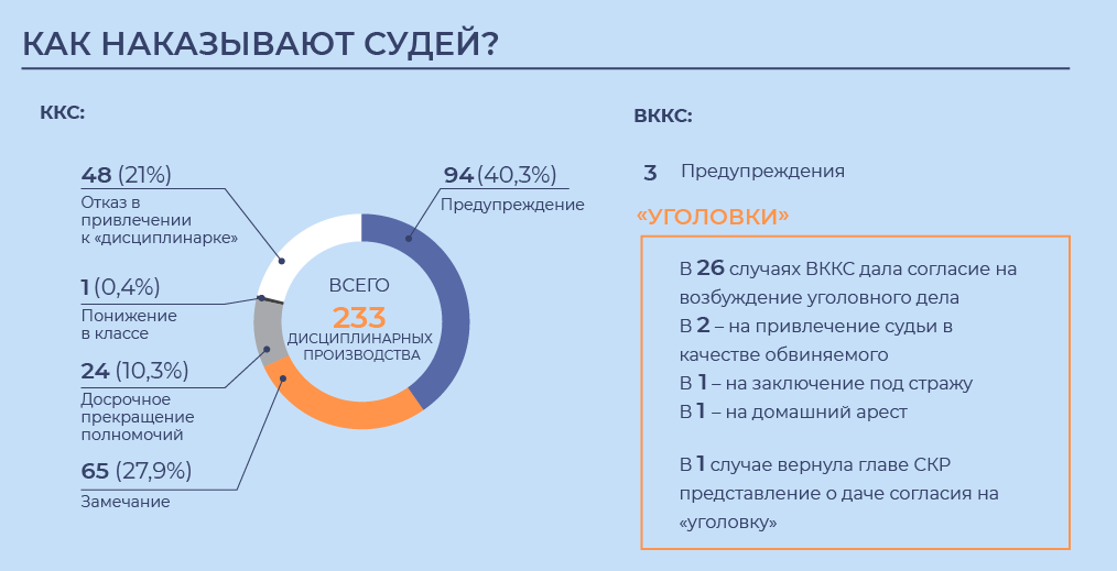 Узнав об этом, председатель суда Сергей Дмитриенко направил обращение в Совет судей, а тот — в ККС. Региональная квалифколлегия пришла к выводу, что Фролова провела столько времени в совещательной комнате, потому что не хотела рассматривать другие материалы. Она потратила пять рабочих дней, чтобы написать постановление на десять листов. Из них восемь посвящены описанию дела, еще один — нормам права, а выводы суда занимают менее одного листа. ККС признала дисциплинарный проступок и наказала Фролову замечанием.