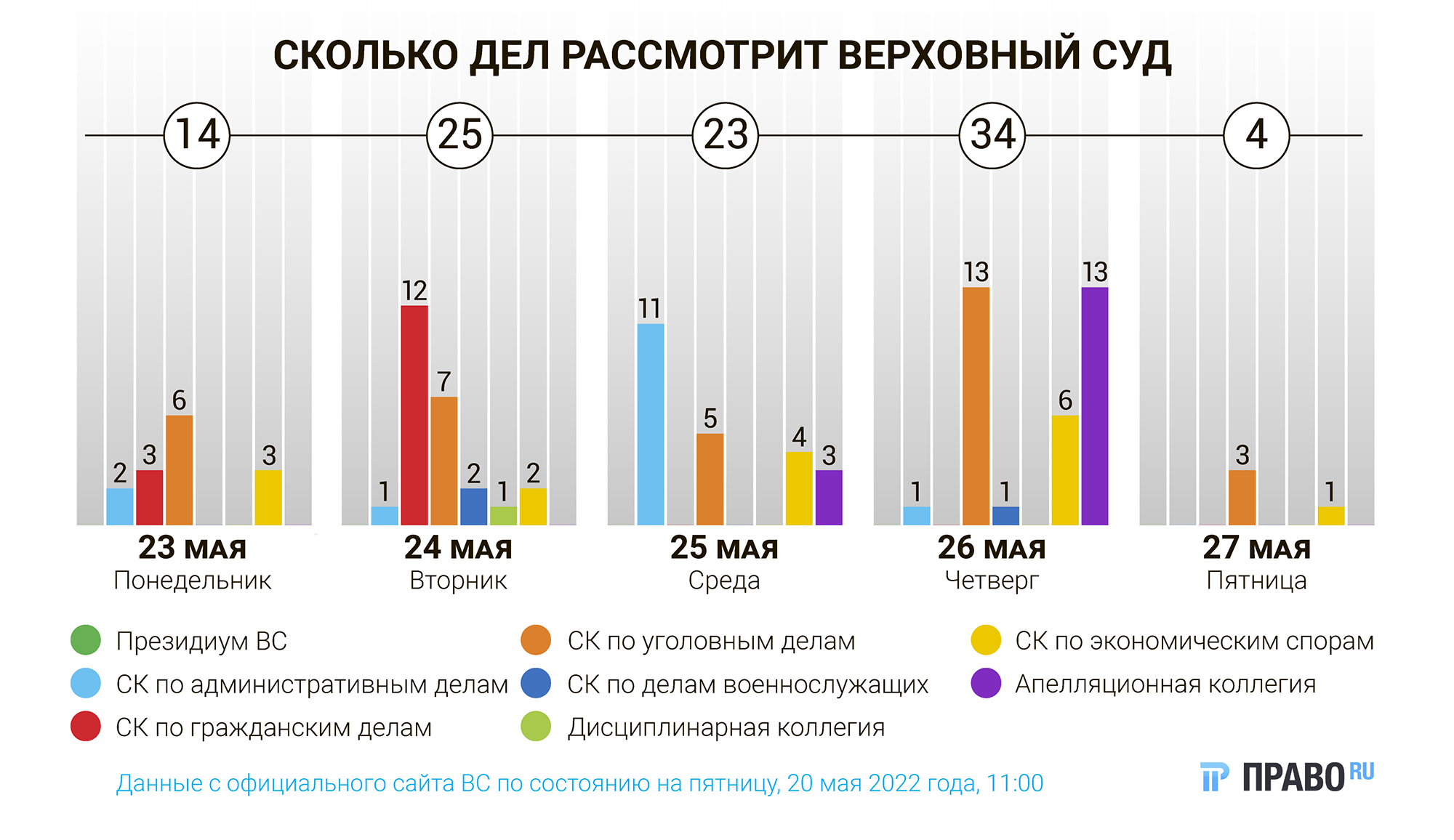 С 23 по 27 мая Верховный суд рассмотрит 100 дел. Экономколлегия будет решать вопрос о перепутанных квартирах застройщика-банкрота. В другом споре судьям предстоит рассмотреть требование о взыскании банком задолженности по кредитному договору, который заключили через электронную систему. Еще СКЭС предстоит разобраться с привлечением к субсидиарной ответственности бывшего руководителя должника и его акционеров. А Генпрокуратура хочет привлечь к административной ответственности зампреда 21-го ААС. За что именно — в открытых источниках информации нет.