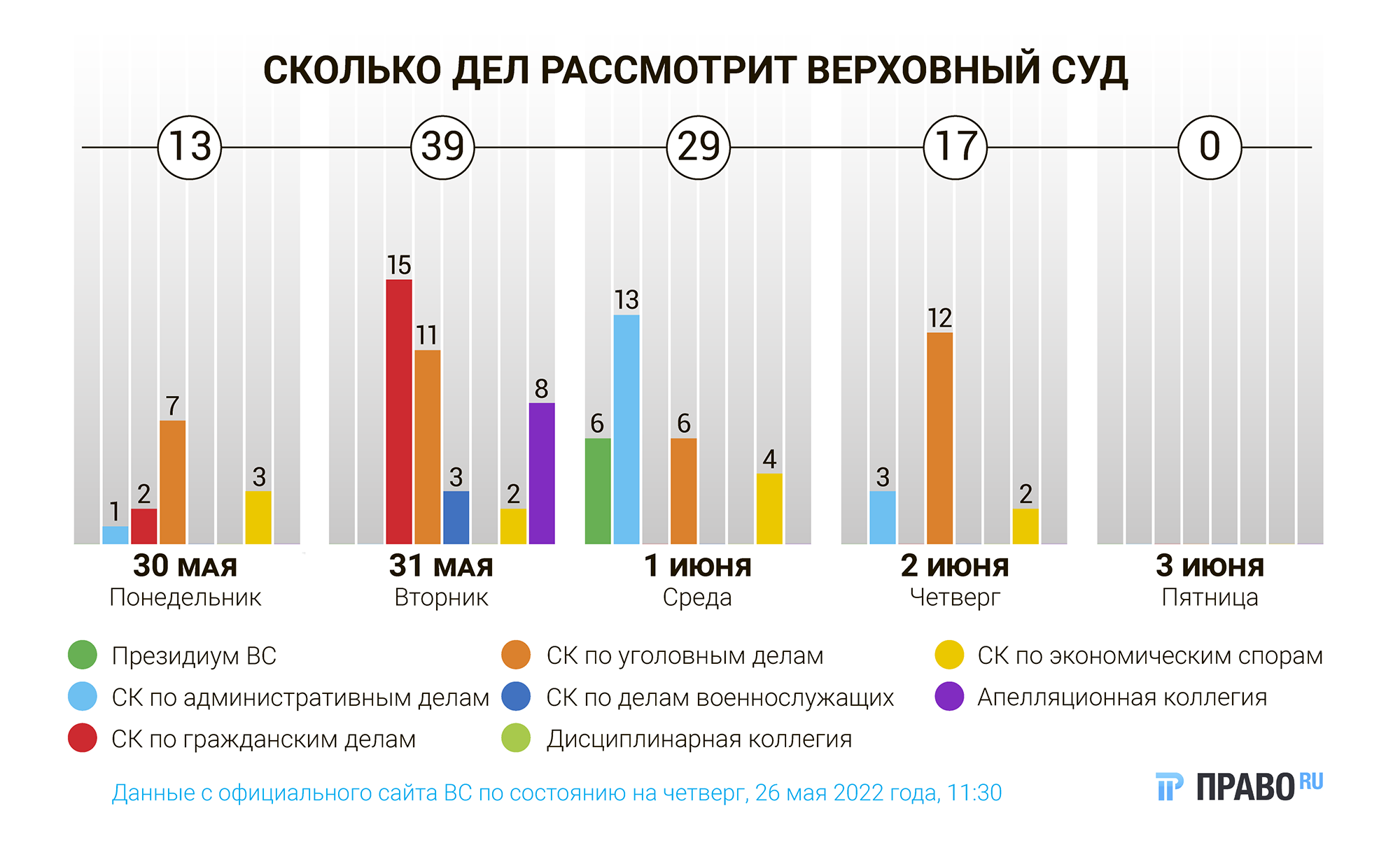 Дисциплинарная коллегия на этой неделе не собирается. Апелляционная коллегия рассмотрит восемь дел, четыре из них без проведения судебного заседания. Коллегия по делам военнослужащих изучит три дела — два уголовных и одно гражданское.