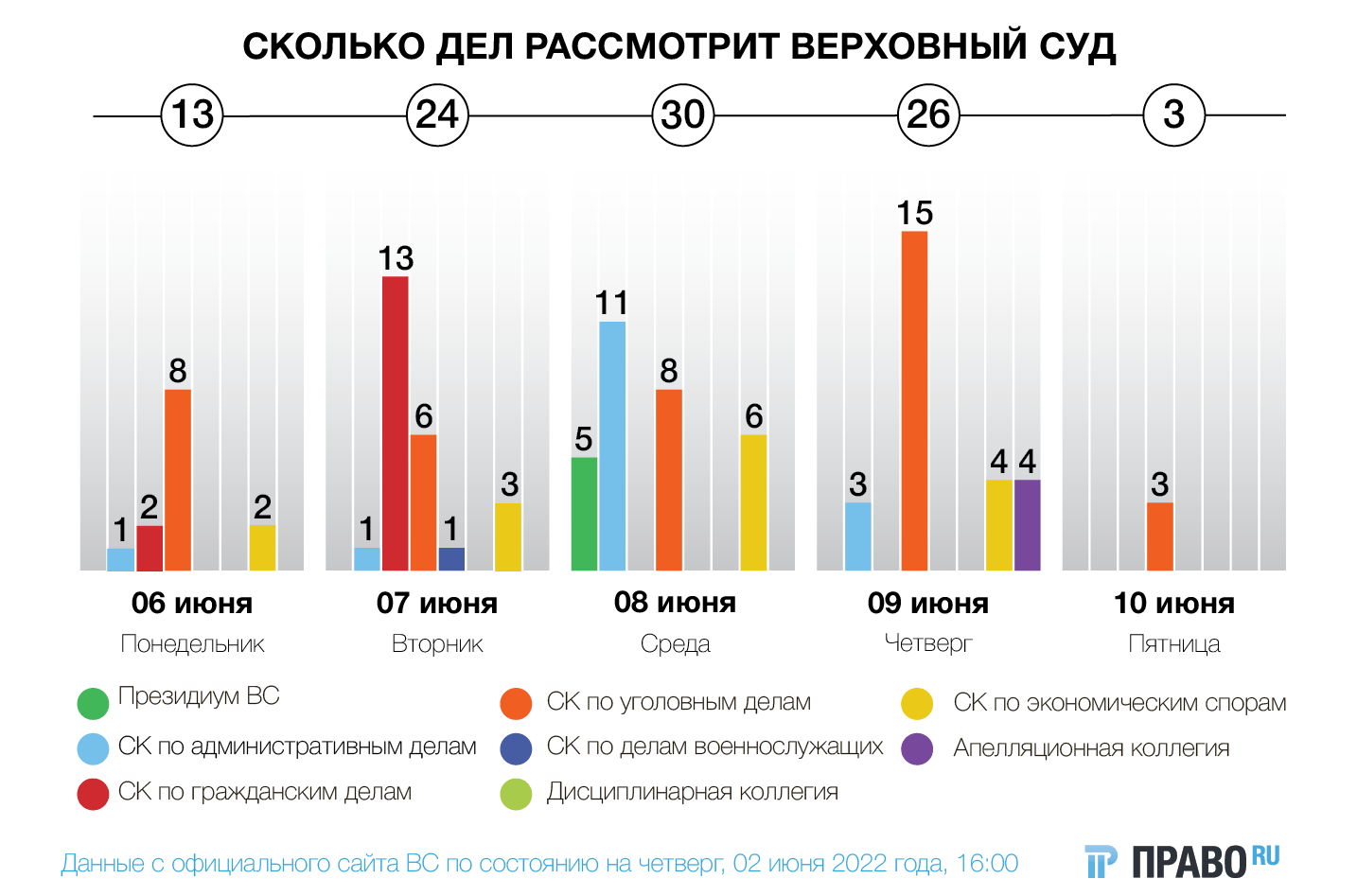 Апелляционная коллегия рассмотрит четыре дела. Судебная коллегия по административным делам — 16. В производстве уголовной коллегии будет 44 дела, в их числе такое.