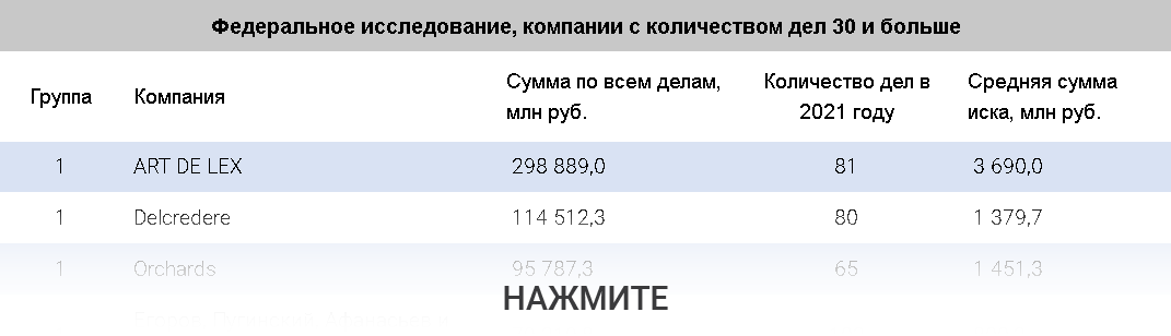 В исследовании федеральных литигаторов с количеством дел от 30 в первую группу попали ART DE LEX, Delcredere, Orchards, «ЕПАМ», «Ковалев, Тугуши и партнеры», «Регионсервис», «Рустам Курмаев и партнеры» и другие.