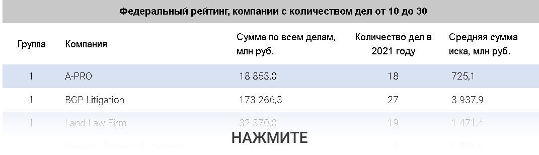 А вот федеральный рейтинг компаний с количеством дел от 10 до 30. В первой группе «А-Про»; BGP Litigation; Land Law Firm; Saveliev, Batanov & Partners; Vinder Law Office; «Гофштейн и партнеры» и прочие.