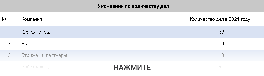 Лидером по количеству споров стала компания «ЮрТехКонсалт», за ней с одинаковым числом дел РКТ и «Стрижак и партнеры». На четвертом и пятом месте, соответственно, расположились «Арбитраж.ру» и «ЕПАМ».