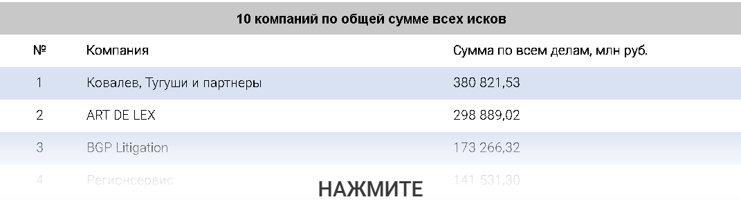 В подборке по общей сумме исков первое место досталось «Ковалев, Тугуши и партнеры», за ним следует ART DE LEX, потом BGP Litigation и «Регионсервис». Замыкает пятерку лидеров Delcredere.