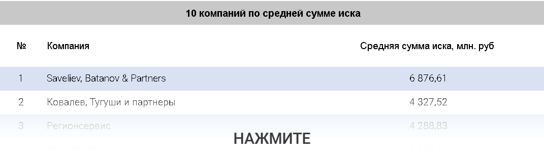 Что касается средней суммы иска, то со значительным отрывом лидирует Saveliev, Batanov & Partners, замыкает первую пятерку ART DE LEX. Между ними расположились «Ковалев, Тугуши и партнеры», «Регионсервис» и BGP Litigation.