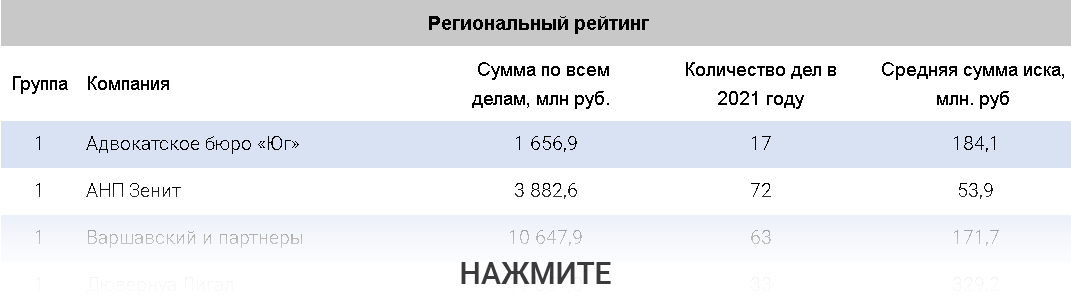 Верхние строчки регионального рейтинга заняли АБ «Юг» (Краснодарский край), АНП «Зенит» и «Шаймарданов и Сабитов» (Казань), «Варшавский и партнеры» и «Дювернуа Лигал» (Санкт-Петербург) и другие.