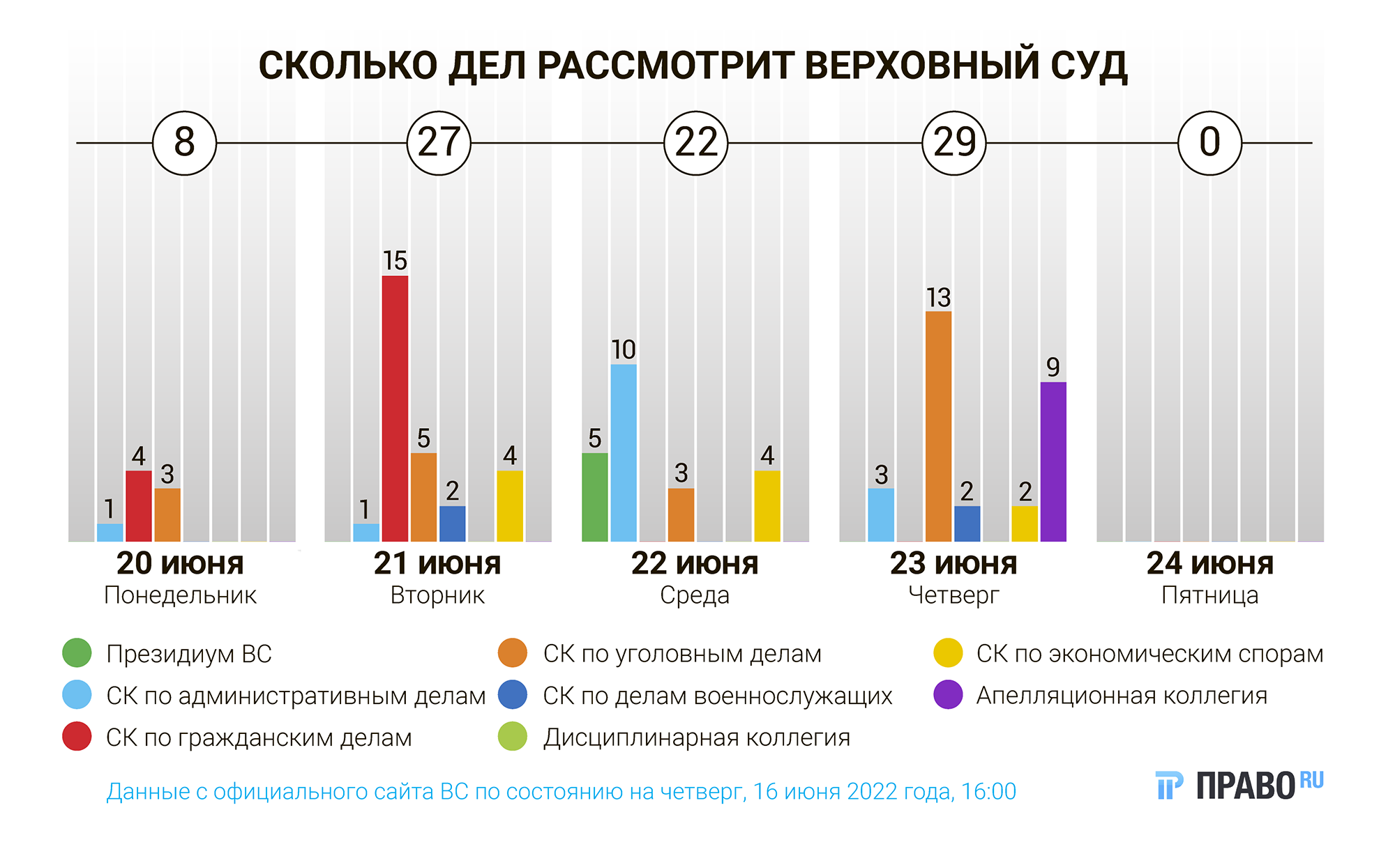 Президиум Верховного суда рассмотрит 5 дел, все они вернулись с постановлениями ЕСПЧ. В дисциплинарной коллегии на этой неделе дел не назначено, зато судейские споры есть в коллегии по административным делам. Всего же с 20 по 24 июня она рассмотрит 15 дел.
