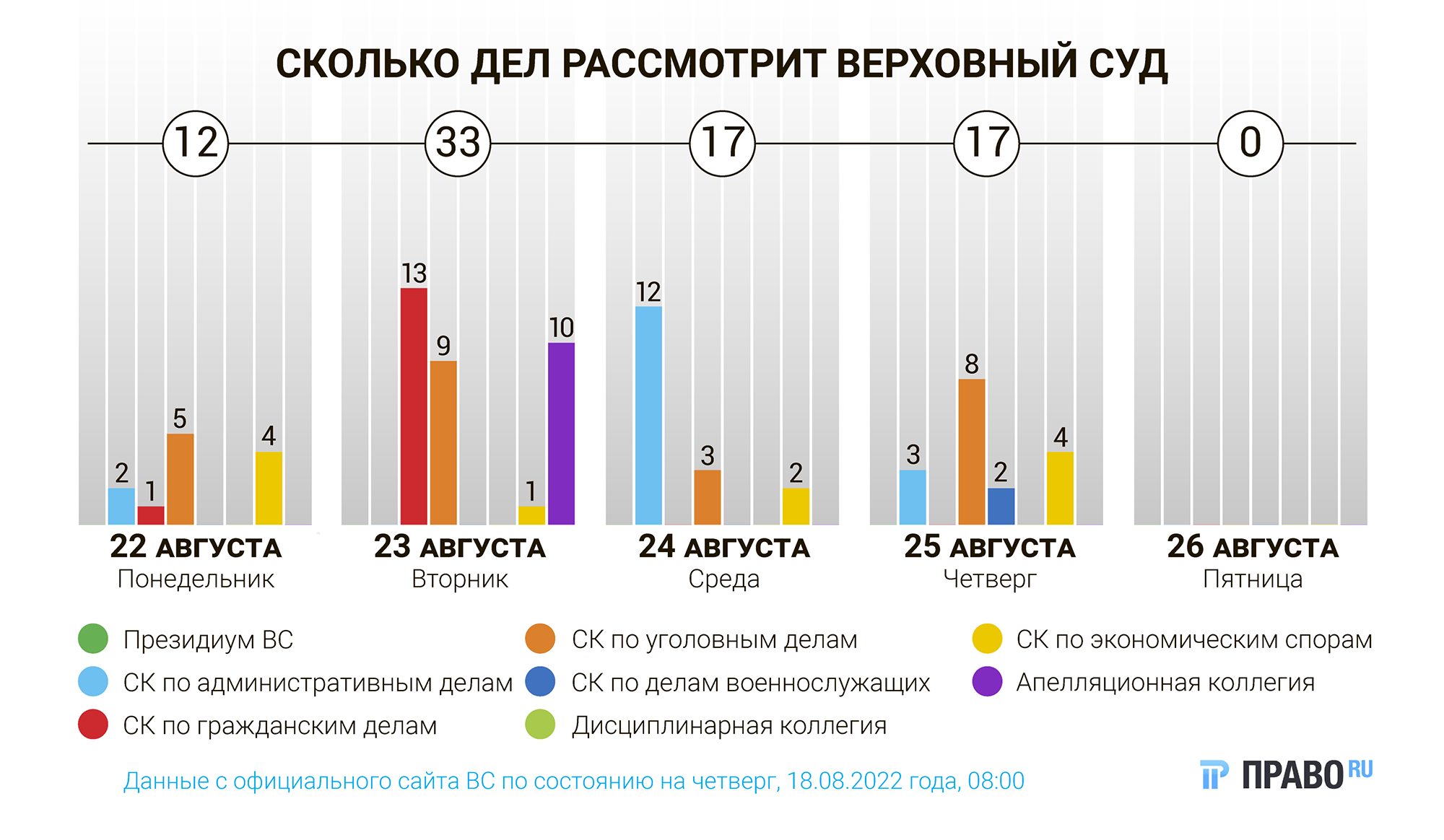 На этой неделе Дисциплинарная коллегия и Президиум ВС не собираются. Коллегия по делам военнослужащих изучит два спора, а коллегия по административным делам - 17. Апелляционная коллегия рассмотрит десять дел, шесть - без судебного заседания, а два из них судейские.
