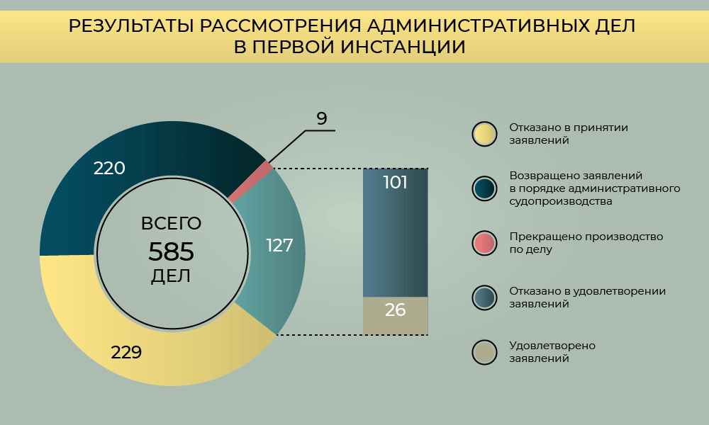 Апелляционная коллегия разобрала 27 уголовных и 235 административных дел. Что касается уголовных дел, то 28 из них затронули 48 человек: в них был вопрос о продлении срока содержания под стражей. Коллегия удовлетворила жалобы на постановления об изменении территориальной подсудности в отношении четырех человек. В удовлетворении остальных жалоб отказано.