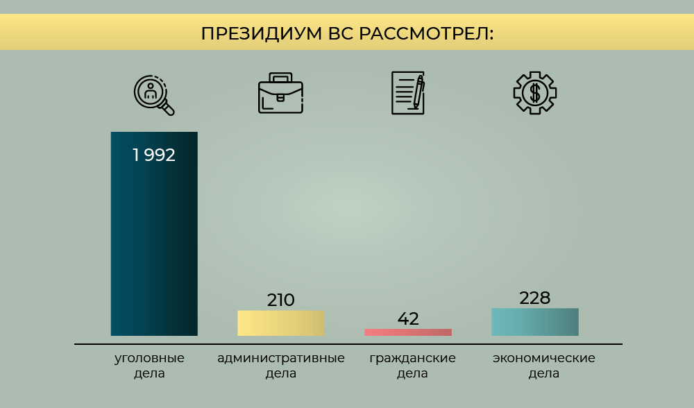 За первые шесть месяцев 2022 года Президиум Верховного суда рассмотрел 1992 представления и жалобы по уголовным делам. В судебном заседании изучили 74 уголовных дела в отношении 87 человек. Удовлетворены жалобы и представления в отношении 66 человек. Трем осужденным смягчили наказания.
