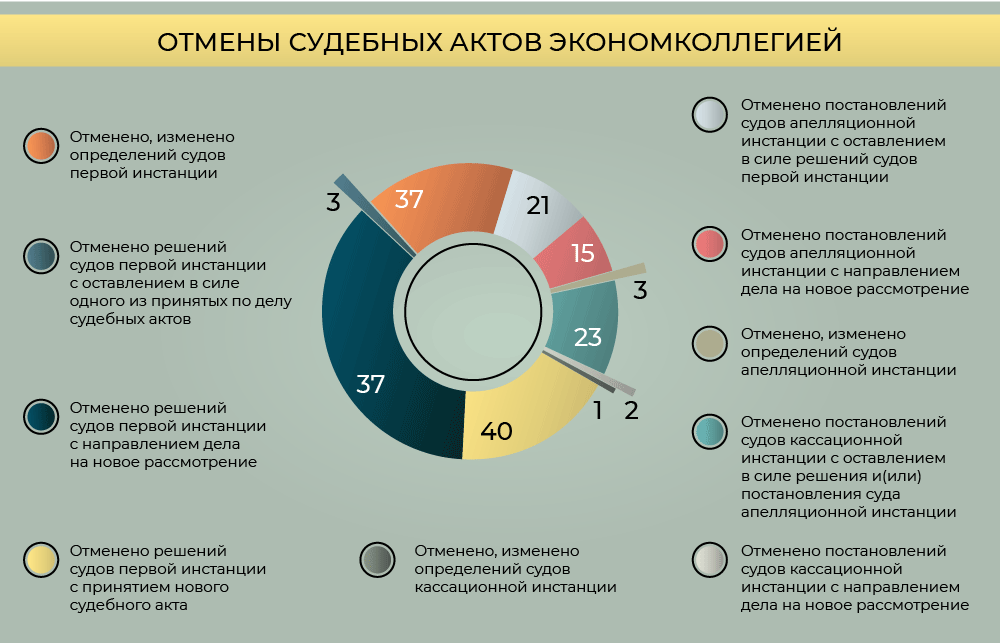 Коллегия удовлетворила 129 кассационных жалоб, в том числе отменила 57 решений суда первой инстанции, 26 апелляционных определений, удовлетворила 14 кассационных жалоб.