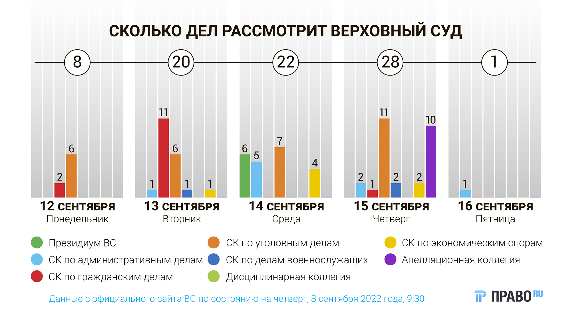С 12 по 16 сентября Верховный суд рассмотрит 79 дел. Особенно насыщенной неделя будет для экономической коллегии. В одном споре ей предстоит определить, обязан ли виновник ДТП выплатить потерпевшему лизинговые платежи как убытки. А в другом придется решить, возможно ли исполнить акт Международного арбитража на территории России. Судьи по гражданским делам разберутся в конфликте между должником и банком, который взыскивал задолженность с нарушением правил подсудности и поэтому пропустил срок исковой давности.