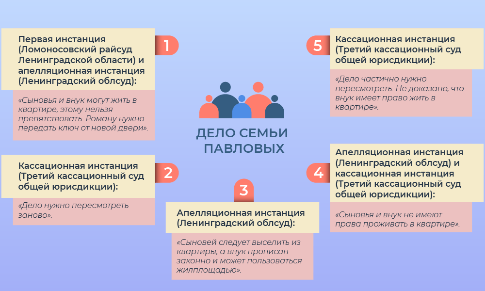 Супруги Павловы, их дочь Оксана и сын Антон с таким решением первой инстанции не согласились и обжаловали его в Ленинградском облсуде (дело № 33-2414/2020). Судья Галина Алексеева изменила решение нижестоящего суда и обязала родителей и сестру не мешать Антону с сыном пользоваться квартирой. После этого Павловы и Оксана написали жалобу в Третий кассационный суд общей юрисдикции (дело № 8Г-16118/2020). Судья Алексей Бакулин отменил апелляционное определение и отправил дело на новое рассмотрение в Ленинградский облсуд.