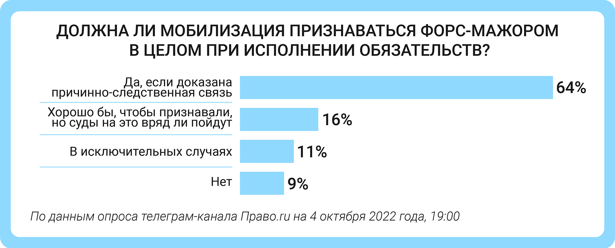 Пользователи телеграм-канала Право.ру, судя по результатам опроса, тоже поддерживают идею признавать мобилизацию форс-мажором. 64% считают, что это возможно, если доказана причинно-следственная связь (то есть невозможность исполнить обязательства именно из-за мобилизации). 16% считают, что «хорошо бы, чтобы признавали, но суды вряд ли на это пойдут». Против идеи проголосовало 9% респондентов.