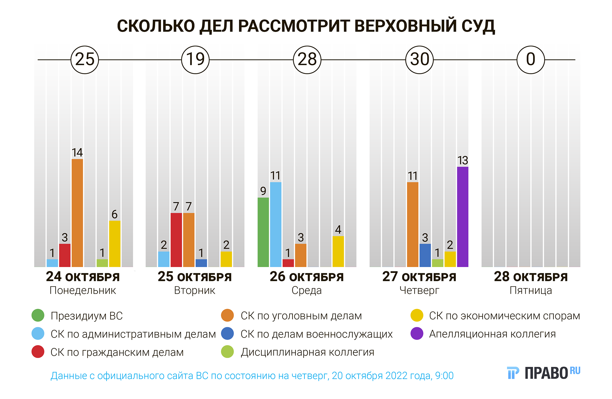 Президиум Верховного суда изучит девять жалоб, все они вернулись с постановлениями ЕСПЧ. Апелляционная коллегия рассмотрит 13 дел, девять из них — без заседания. Дисциплинарная коллегия соберется дважды — оба раза, чтобы выслушать жалобы на решения ВККС и ККС о досрочном прекращении полномочий судей.