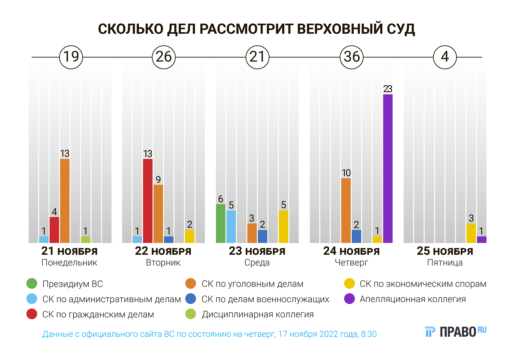 Апелляционная коллегия рассмотрит 24 дела, 18 из них — без заседания. Ольга Кравцова* оспаривает решение ВККС, которая посчитала, что смерть председателя Тульского гарнизонного военного суда Валентина Черняка не связана с исполнением служебных обязанностей. Кравцова утверждает, что Черняк заразился коронавирусом на рабочем месте, а потом скончался от заболевания. Истец пояснил, что судья с 10 по 30 октября 2020 года общался с инфицированным сотрудником военной прокуратуры, но ВККС не проверила эти обстоятельства. ВС отметил, что у Черняка кроме CОVID-19 была военная травма, которая прогрессировала, а судья регулярно проходил лечение и постоянно принимал лекарства (дело № АКПИ22-477). В материалах нет доказательств, что смерть Черняка напрямую связана с исполнением служебных обязанностей.