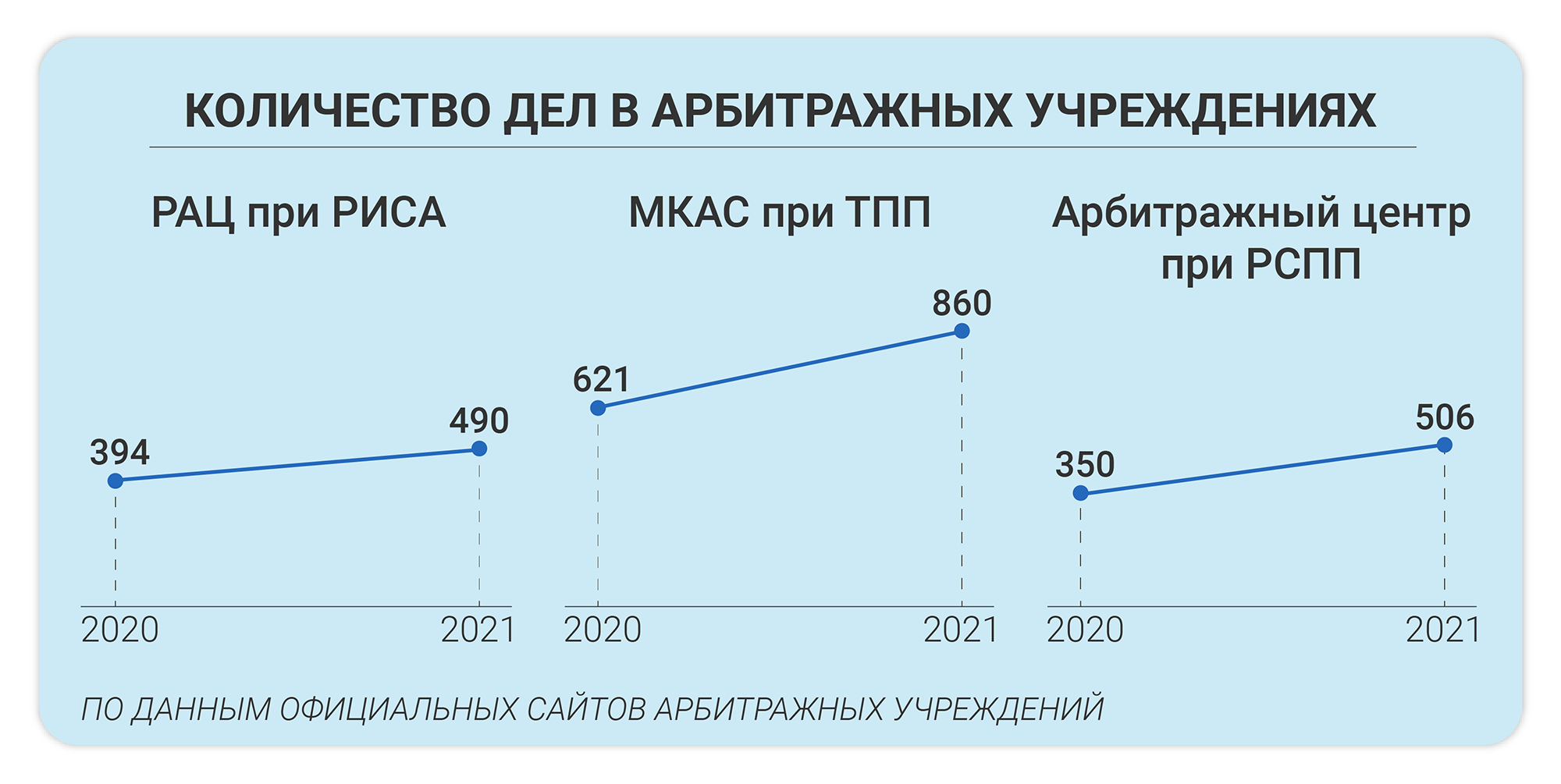 Судя по статистике наиболее популярных в России арбитражей — МКАС, РАЦ и АЦ при РСПП, с каждым годом третейские суды исследуют все больше споров. Из-за сложной внешнеполитической обстановки и складывающейся судебной практики есть вероятность, что интерес к ним продолжит расти.