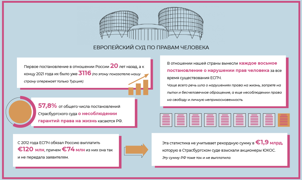 Уже в июне Госдума приняла законы о выходе из-под юрисдикции Европейского суда по правам человека. Решения, которые вступили в силу после 15 марта 2022 года, не будут исполняться в РФ. К тому же постановления ЕСПЧ больше не основание для пересмотра актов российских судов. Все выплаты будут проводиться до конца 2022 года, но в рублях и только на счета в российских банках.