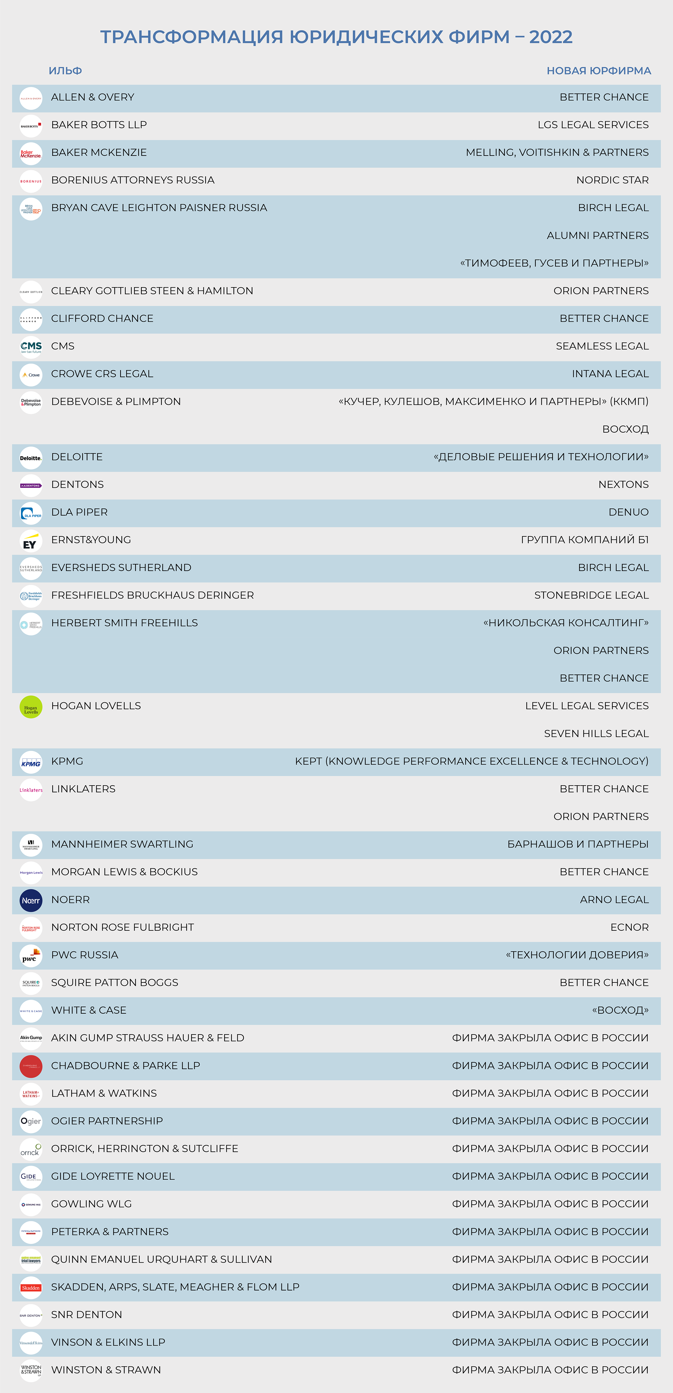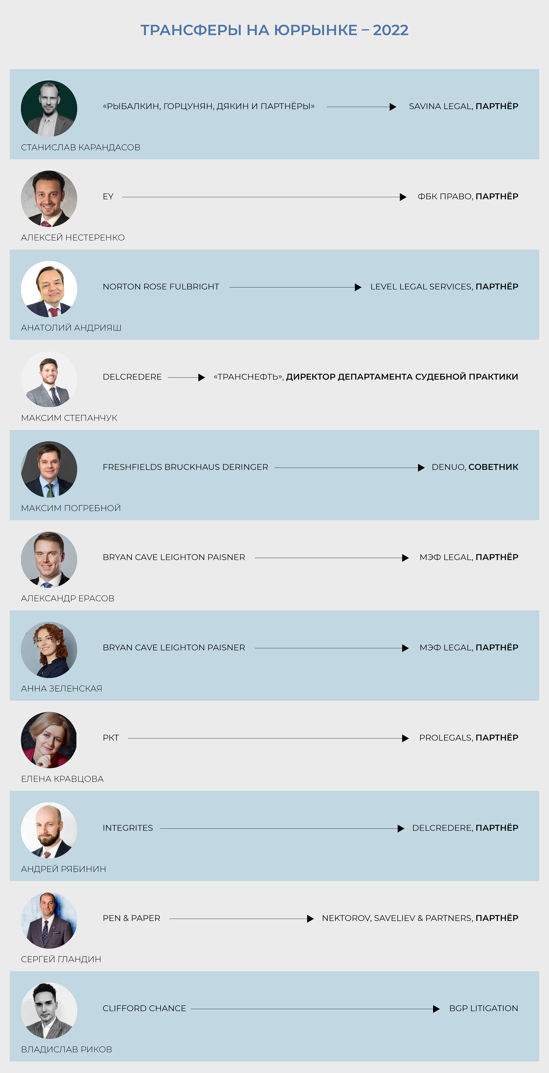 При этом ярких трансферов, то есть переходов крупных юристов к условным конкурентам, в 2022-м почти не было. «В основном все внимание было сосредоточено на переходах ильфов в рульфы или ньюльфы», — подтверждает Ольга Макарова из департамента конференций и рекламы Право.ru. Воспользоваться ситуацией смогли российские фирмы, которые активно приглашали на партнерские должности отколовшихся от ушедших фирм юристов. Мы насчитали сразу несколько таких заметных переходов.