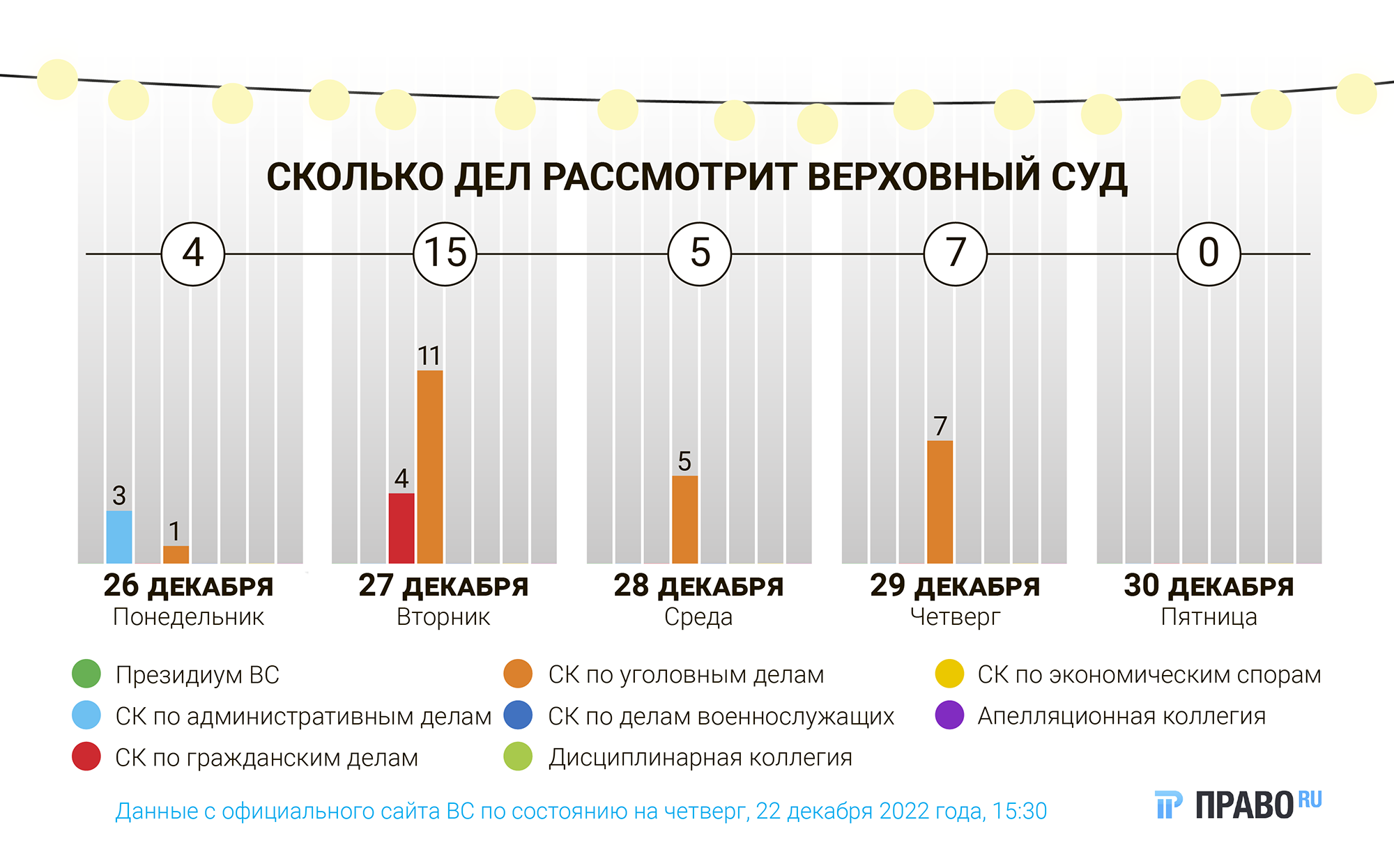 Верховный суд вместе со всеми уйдет на новогодние каникулы в конце этой недели, а до этого успеет рассмотреть 31 вопрос — в четыре раза меньше, чем на предыдущей неделе. Заседать будут только три коллегии. Гражданская закончит разбираться в споре об использовании в программе «Поле Чудес» песни «Зимушка-зима». Другие споры недели — в нашем микродайджесте.