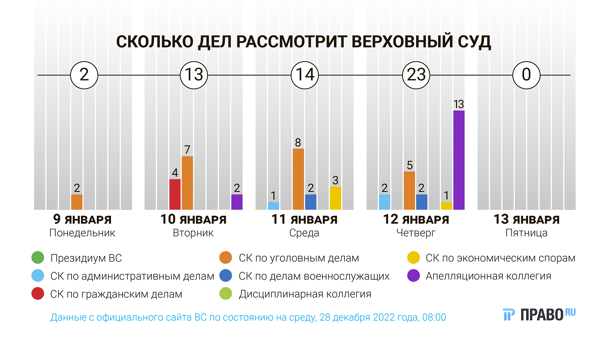 Президиум Верховного суда и дисциплинарная коллегия на этой неделе не собираются. Коллегия по делам военнослужащих исследует четыре спора, а по административным делам — три.