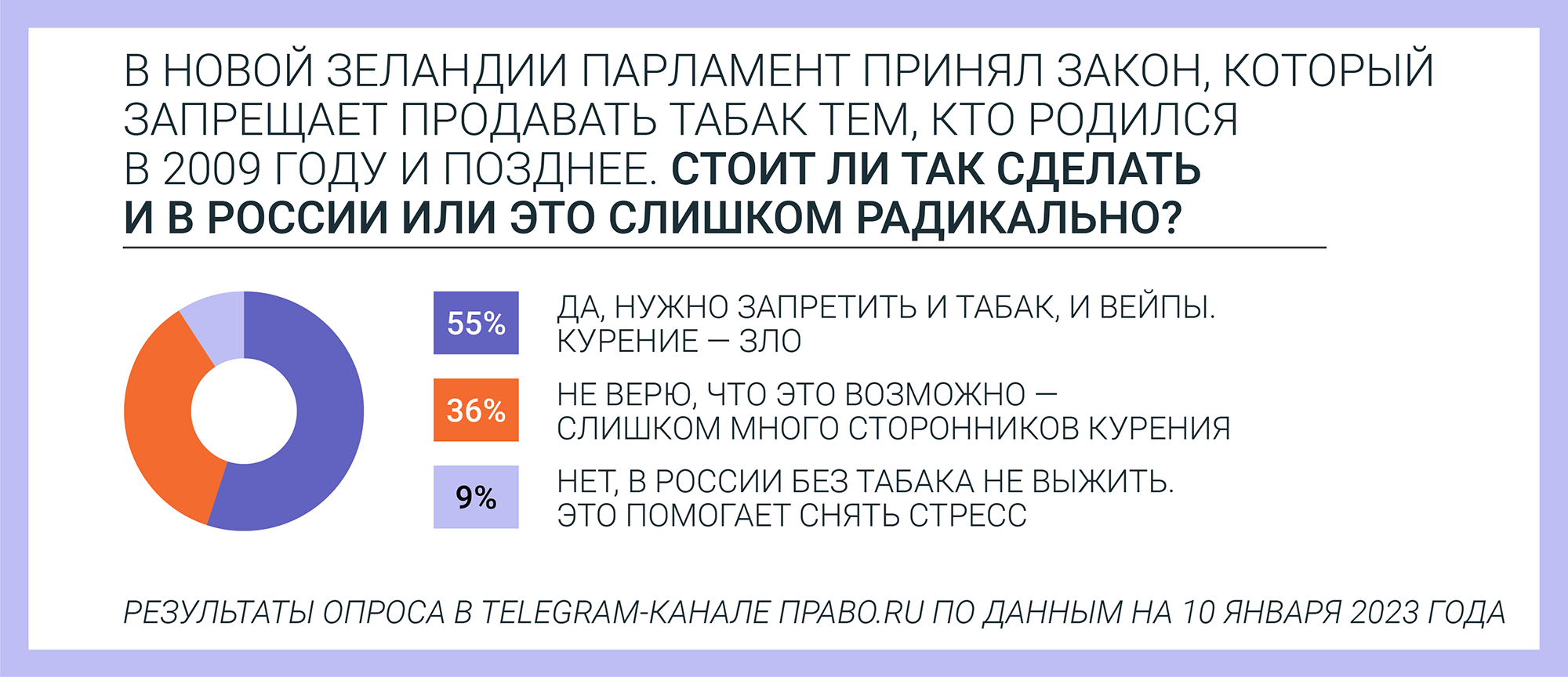 Со ссылкой на исследование SuperJob, РБК сообщает, что 50% россиян поддерживают запрет на продажу табака тем, кто родился после 1 января 2009-го. Среди читателей нашего телеграм-канала мы провели похожий опрос. Большинство опрошенных согласилось: стоит запретить и табак, и вейпы.