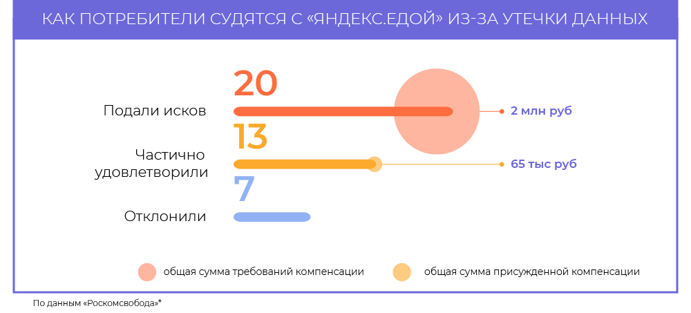 Еще пострадавшие клиенты могут потребовать компенсировать им моральный вред. «Ведомости» сообщали, что пострадавшие от утечки пользователи «Яндекс Еды» подали несколько коллективных исков. В первом 33 клиента требовали компенсировать им 100 000 руб. морального вреда каждому. Из-за утечки они стали получать много рекламных обращений и звонков от мошенников. По их мнению, таким образом нарушили неприкосновенность частной жизни. Как следует из материала издания, интересы истцов представлял Борис Фельдман, директор по правовым вопросам юридического сервиса Destra Legal. В картотеке Замоскворецкого районного суда Москвы, куда и подавали заявление, зарегистрировали иск против компании от его имени (дело № М-2624/2022). Из карточки дела следует, что заявление вернули, так как дело неподсудно этому суду. Само определение о возвращении пока не публиковали. Известно лишь, что на него подавали частную жалобу, а сейчас дело в канцелярии.