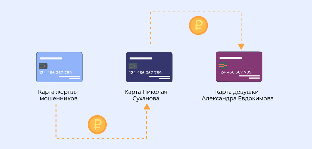 Жертва мошенников перечислила деньги на счет некоего Николая Суханова*. Его карту преступники использовали для кражи денег, а сам Суханов получал за это небольшой процент. Именно со счета Суханова деньги поступили на карту девушки Евдокимова.