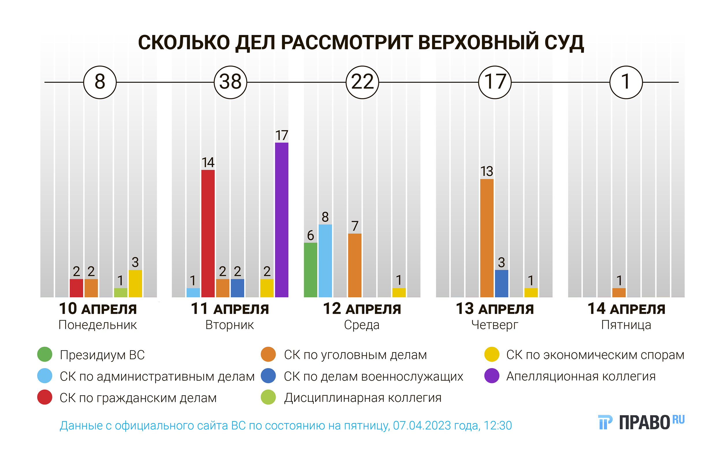 В коллегии по уголовным делам 25 споров, в коллегии по делам военнослужащих — семь, а в админколлегии — девять. В дисциплинарной коллегии один спор — дело № ДК23-23. Там судья Ольга Ткачева из Ленинского районного суда Санкт-Петербурга обжалует решение местной ККС о досрочном прекращении ее судейских полномочий. На сайте петербургской квалифколлегии указано, что председатель райсуда Елена Венедиктова обратилась в ККС, потому что усмотрела в действиях коллеги признаки дисциплинарного проступка. На заседании ККС 17 февраля 2023 года должны были рассмотреть заключение комиссии квалифколлегии по этому вопросу, само решение пока не публиковали.