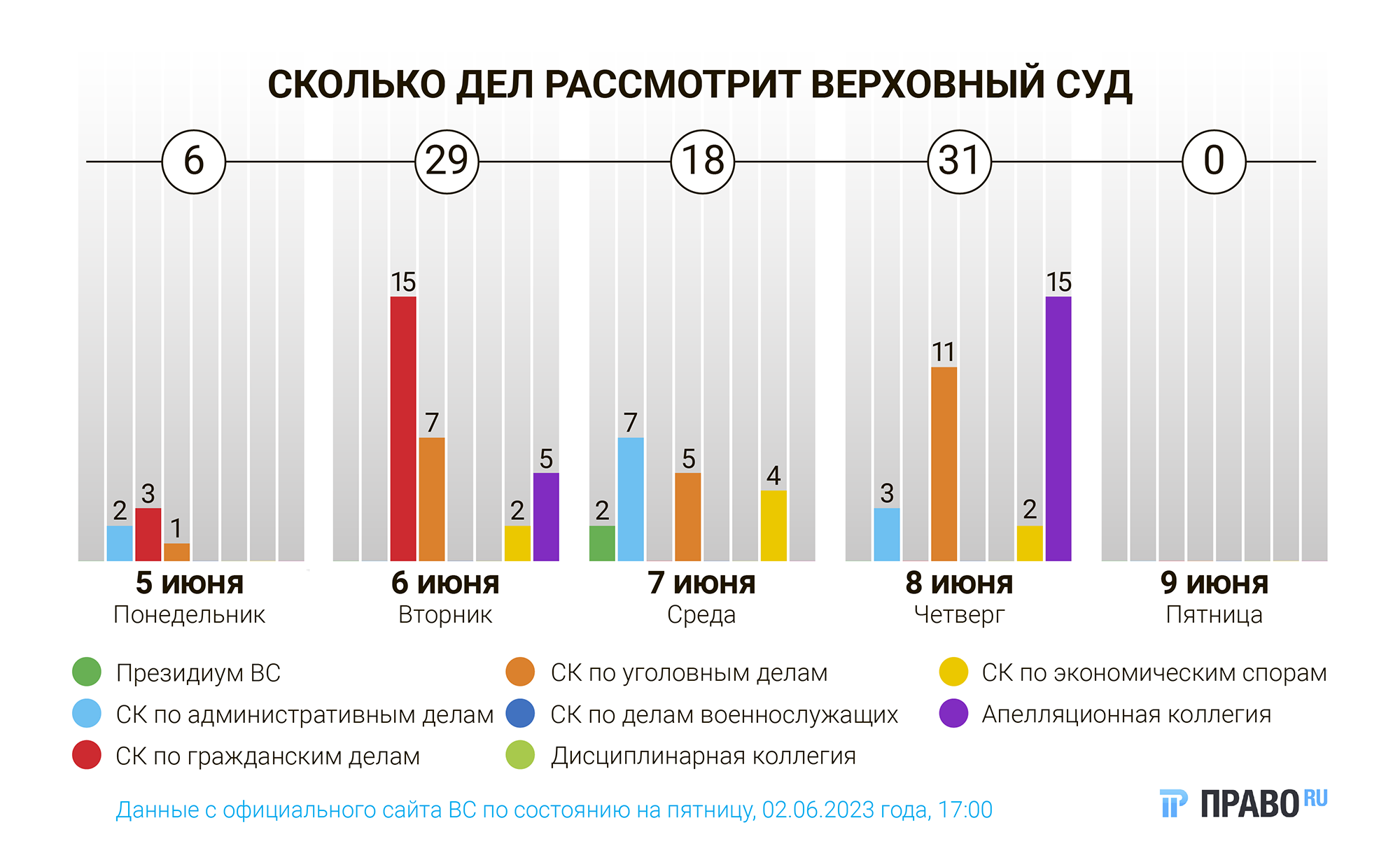 В апелляции назначено 20 дел, одно из них — судейское. Судья в отставке Елена Гарсия оспаривает решение ВККС, которая позволила СКР возбудить на нее дело по ч. 3 ст. 264 УК («Нарушение правил дорожного движения и эксплуатации транспортных средств»). Следователи считают, что обвиняемая устроила аварию, в которой погиб водитель другой машины. Гарсия настаивает, что ДТП произошло из-за дефектов у дорожного полотна. Судье в отставке не удалось убедить в этой версии судей админколлегии ВС.