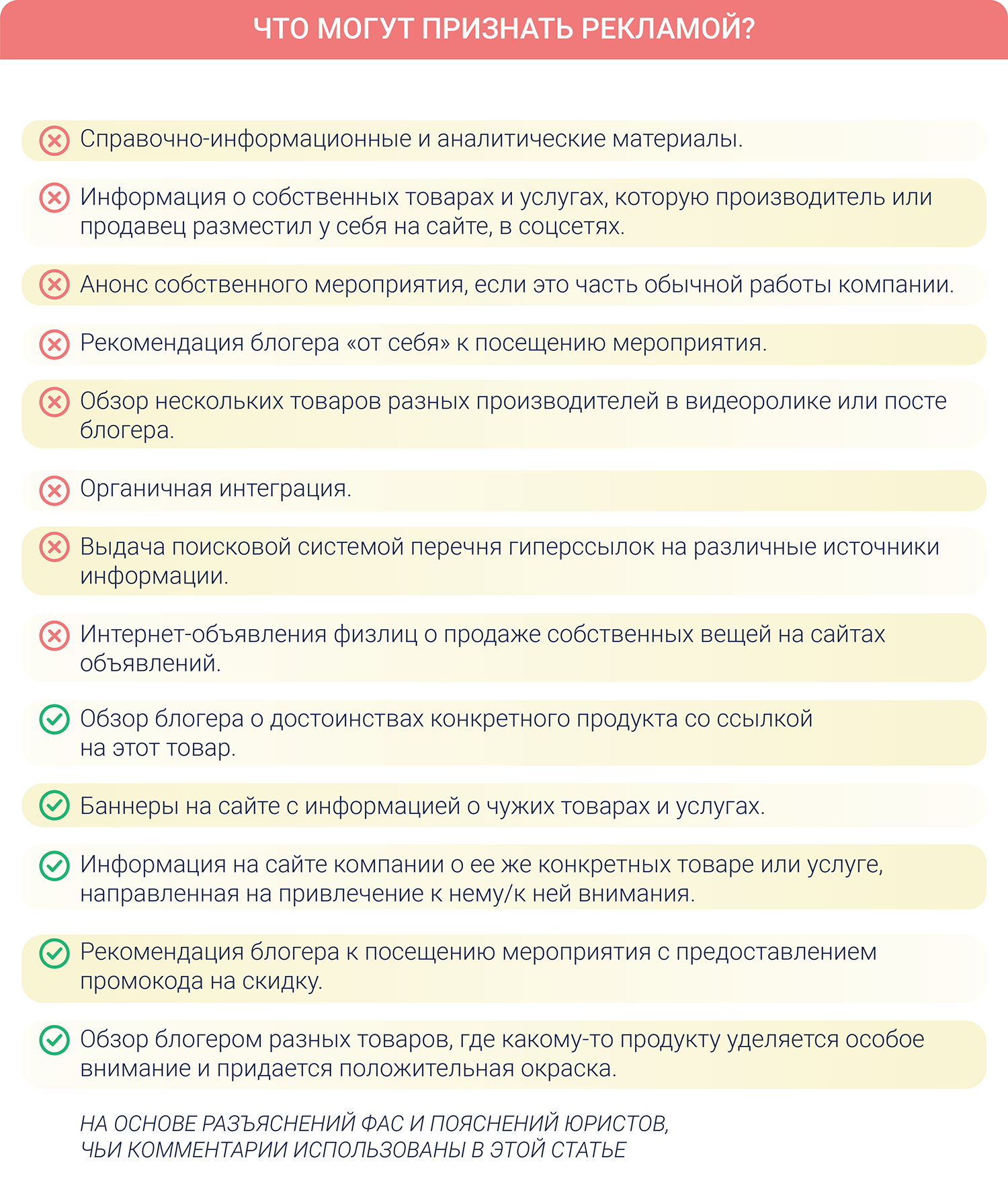ФАС по этому поводу заявляла: каждый случай оценивают индивидуально исходя из содержания и обстоятельств размещения, говорит Кот. По закону «О рекламе» интернет-реклама распространяется в сети на неопределенное количество людей и направлена на то, чтобы привлечь их внимание к объекту рекламирования, будь то товар, мероприятие, бренд.