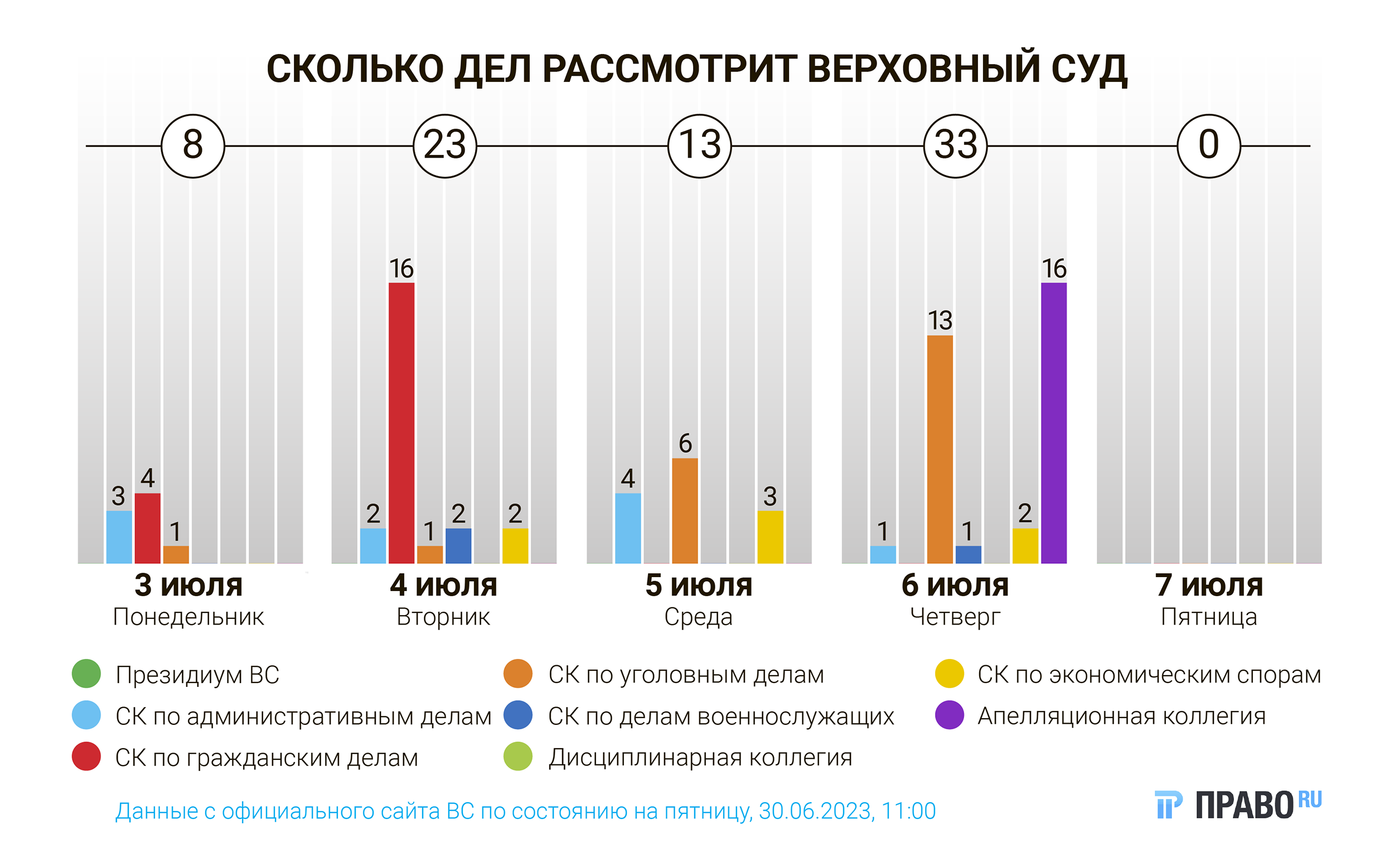 Президиум ВС на неделе собираться не будет, в дисциплинарной коллегии запланировано одно дело. В прошлом году судья Алексеевского районного суда Волгоградской области Антон Антамошкин стал виновником ДТП. Медицинское освидетельствование подтвердило, что в момент аварии Антамошкин находился в состоянии опьянения. Сам судья уверял, что в тот день использовал препарат от боли в горле, в состав которого входит этиловый спирт. По мнению ККС Волгоградской области, он не доказал, что мог принять столько препарата, чтобы опьянеть. 16 декабря 2022 года квалифколлегия досрочно прекратила полномочия Антамошкина, в апреле этого года это решение поддержала и ВККС (подробнее — «Пьяное ДТП и опоздания на работу: как прошел день жалоб в ВККС»). Поэтому Антамошкин пожаловался в Верховный суд. Дело № ДК23-62 рассмотрят 6 июля.
