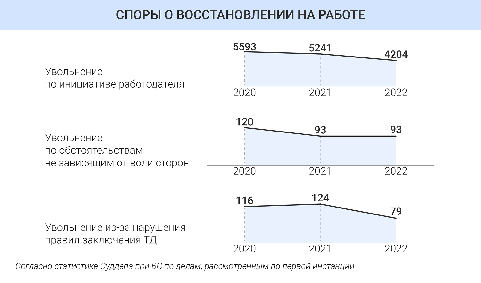 Дела о признании незаконными дисциплинарных взысканий и увольнений — одна из самых распространенных категорий трудовых споров, говорит Фурсова. Из статистики Судебного департамента видно, что увольнение по инициативе работодателя оспаривают чаще всего. Такая динамика сохраняется на протяжении последних трех лет.