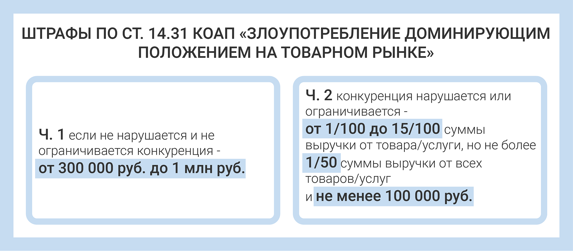 Ст. 10 ЗоЗК запрещает компаниям злоупотреблять доминирующим положениям. В том числе, доминирующим на рынке фирмам нельзя безосновательно устанавливать цены или тарифы на один и тот же товар. Если нарушить этот запрет, бизнесу грозят внушительные штрафы по ст. 14.31 КоАП.