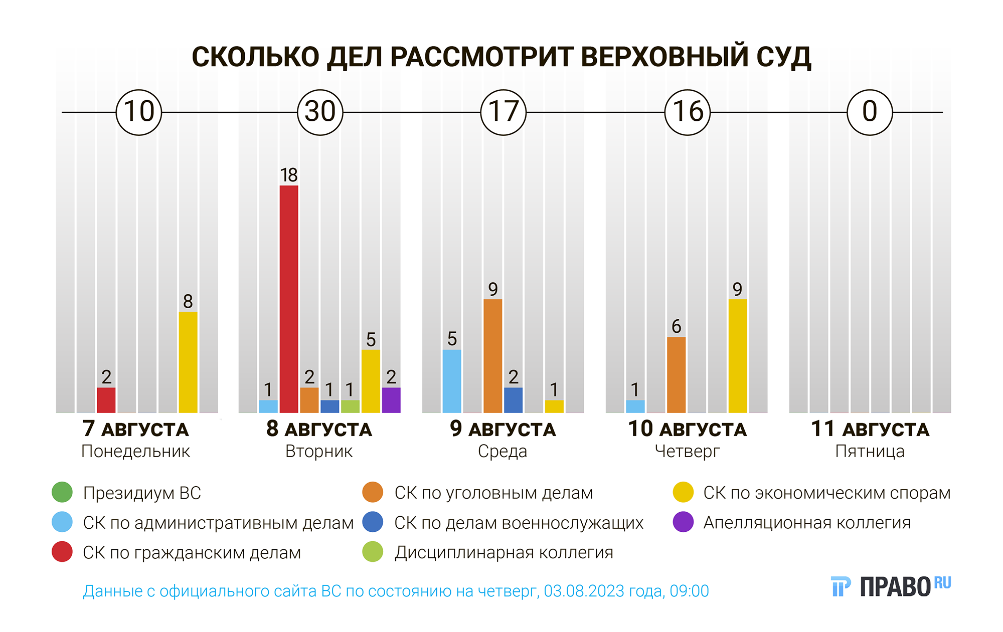 На неделе с 7 по 11 августа Верховный суд рассмотрит 73 дела, треть их них — в экономколлегии. Ей предстоит разобраться с размером субсидиарной ответственности руководителей бизнеса по налоговым обязательствам и выяснить, мог ли юрист с доверенностью переписать личные активы доверителя на компанию. Коллегия по гражданским делам рассмотрит дело, в котором покупатель бракованного айфона отправил претензию не на тот адрес, а еще разберется в споре о возврате денег за курсы для предпринимателей.