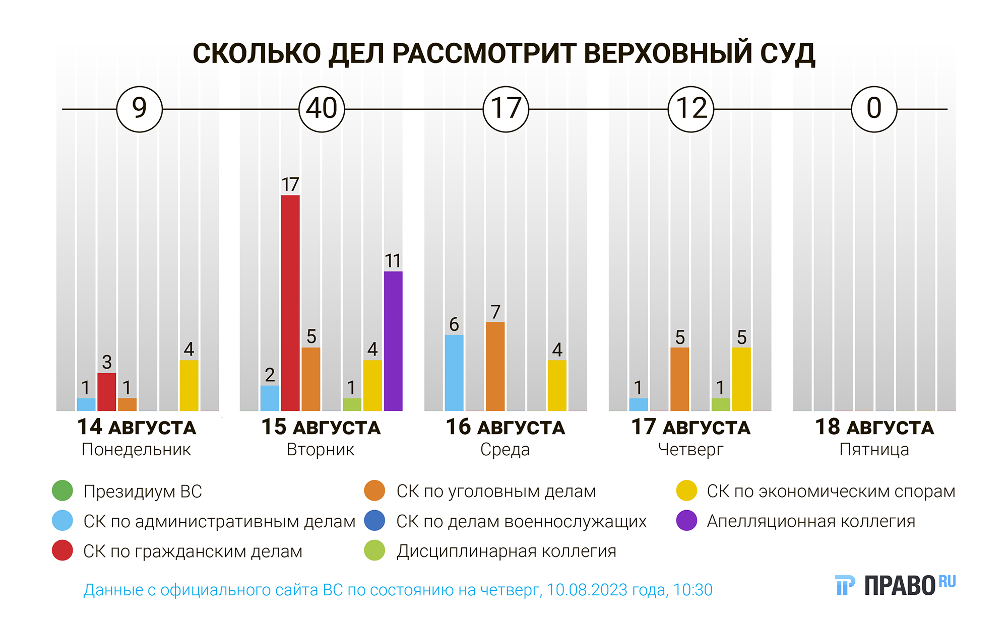 На неделе с 14 по 18 августа Верховный суд рассмотрит более 70 дел. Экономколлегия разберется, навредило ли увеличение уставного капитала компании общему имуществу супругов. В другом споре СКЭС объяснит, в какую очередь реестра требований кредиторов включать расходы на погребение. Еще в одном деле ВС определит, как считать налоги, если акционерная компания стала ООО. Коллегия по гражданским делам рассмотрит спор о возврате денег за автомобиль, в котором случился пожар спустя несколько месяцев после покупки.