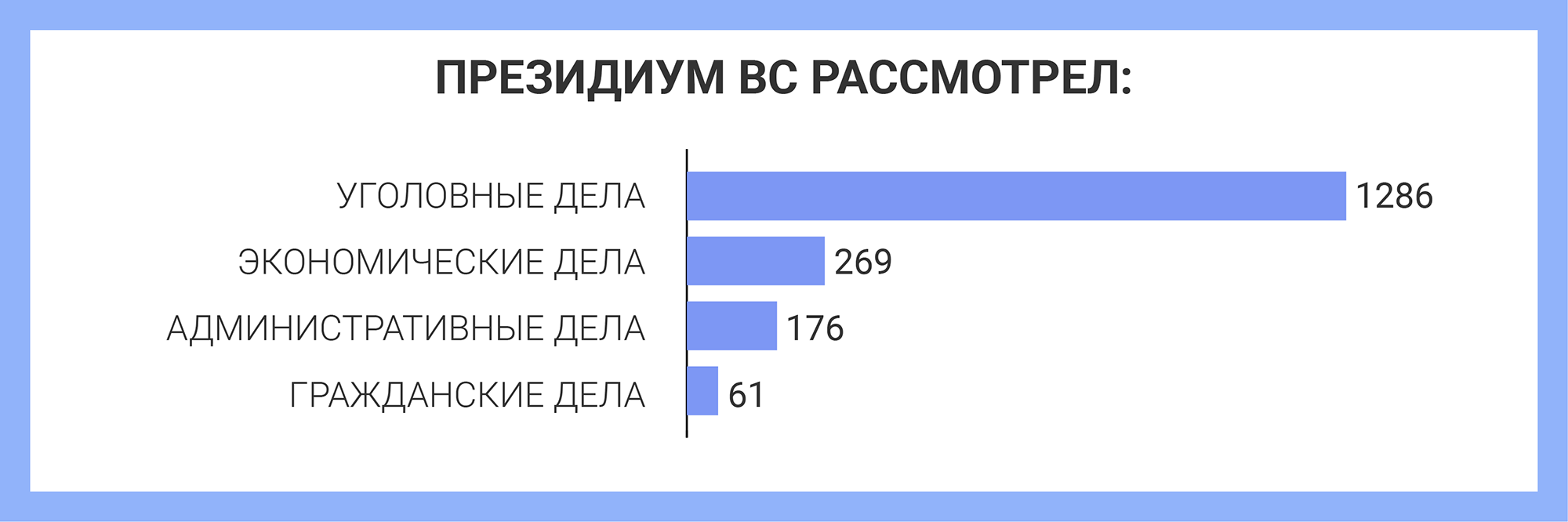 За шесть месяцев Президиум Верховного суда рассмотрел 1286 представлений и жалоб по уголовным делам — это почти на 65% меньше, чем за аналогичный период прошлого года (1992). На судебных заседаниях изучили 49 дел, затрагивающих 55 человек. В результате удовлетворили жалобы и представления в отношении 42 человек. Приговор отменили четверым — дела отправили на новое рассмотрение.