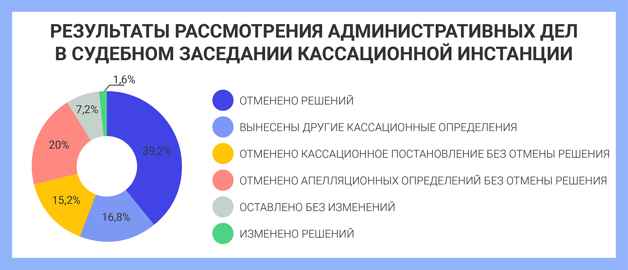В первом полугодии Апелляционная коллегия рассмотрела 342 административных, 33 уголовных и четыре гражданских дела. Решения по административным делам обычно оставляли без изменения: из 298 рассмотренных дел решение отменили только по одному (после отказа от иска), а одно дело прекратили. В трех спорах коллегия изменила или отменила вынесенные определения.