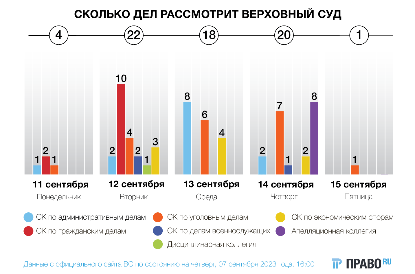 Президиум на этой неделе не собирается. Судейские споры в этот раз рассмотрят сразу три коллегии — апелляционная, дисциплинарная и по административным делам. В первой всего восемь споров, во второй один и в третьей — 13.