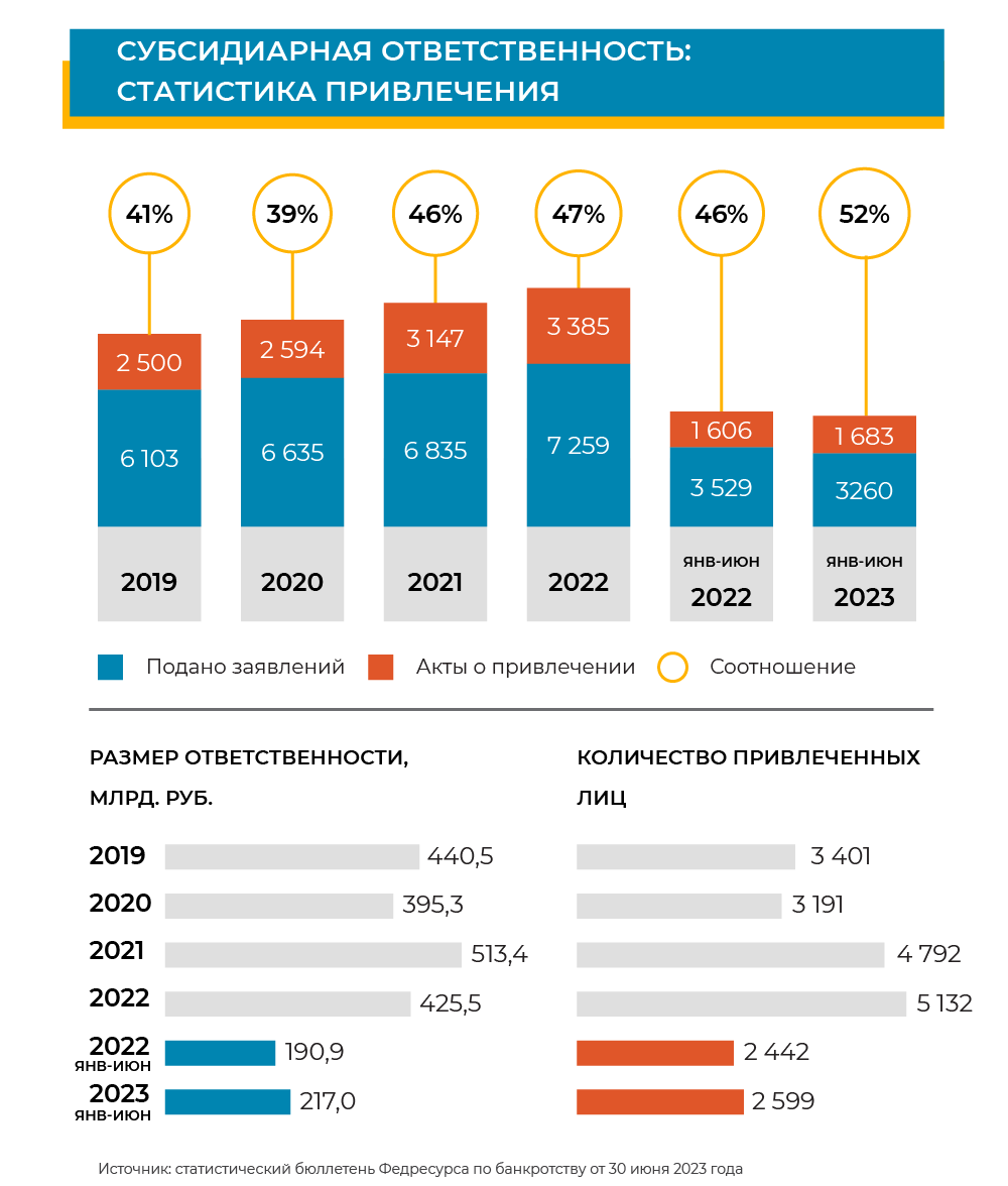 При этом Пермяков замечает другую тенденцию: суды стали охотнее привлекать КДЛ к ответственности на основе лишь косвенных доказательств и перекладывать на ответчиков бремя опровержения их контроля над должником. Этот тезис косвенно подтверждает статистика «Федресурса». Согласно данным статистического бюллетеня, за первую половину года суды привлекли 2599 контролирующих должников лиц к субсидиарной ответственности — незначительно больше, чем годом ранее, когда было 2442 привлеченных. Несколько увеличился процент «побед» кредиторов и управляющих по таким спорам: с 46% в первом полугодии 2022-го до 52% за шесть месяцев 2023-го. За прошедший год вырос и размер совокупной имущественной ответственности КДЛ.