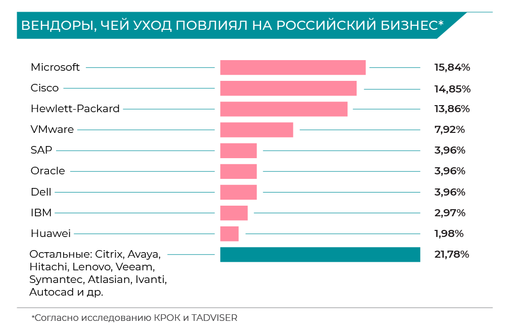 По данным исследования Naumen, 56% российских компаний лишились техподдержки из-за ухода иностранных IТ-вендоров (правообладатели программного обеспечения) с отечественного рынка, писал Forbes в октябре 2022-го. А согласно исследованию «Крок» и Tadviser, которое провели в конце 2022-го, уже 68,5% компаний испытали проблемы, поскольку больше не могли обновлять программное обеспечение и пользоваться сервисными гарантиями и зарубежными облаками. К тому же подорожали компоненты и пришлось искать альтернативные решения. Исследование провели среди IT-руководителей топ-600 компаний РФ и энтерпрайз-бизнеса в ретейле, финансах, энергетике, промышленности и нефтегазовой отрасли.