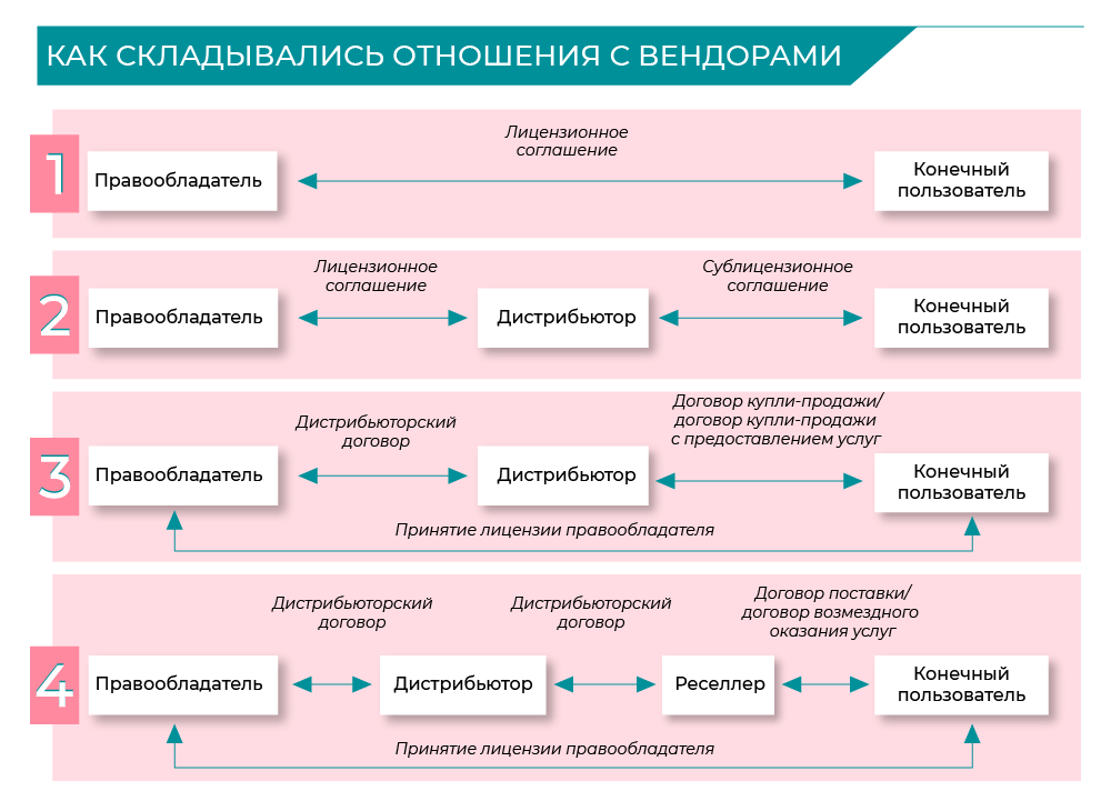 И если компании, согласно итогам того же исследования «Крок» и Tadviser, постепенно приспособились к новым реалиям с точки зрения ИТ-решений, уход вендоров породил новое направление работы для юристов. Так, участники правоотношений — вендоры, дистрибьюторы и конечные пользователи — стали активно спорить друг с другом. Чтобы понять суть разбирательств, нужно понять, как строилось взаимодействие внутри этой цепочки.